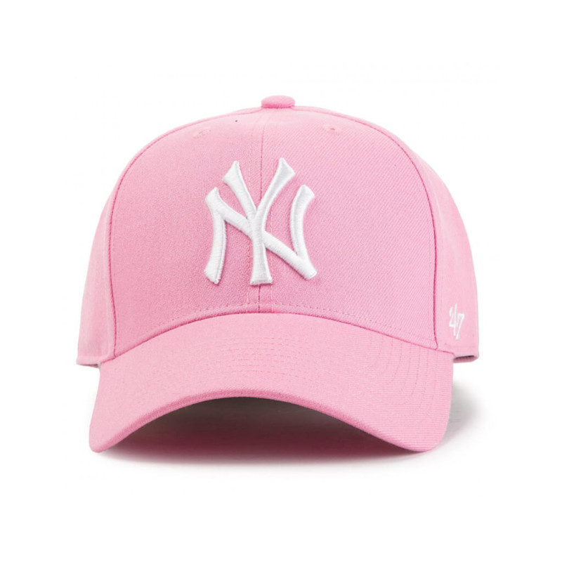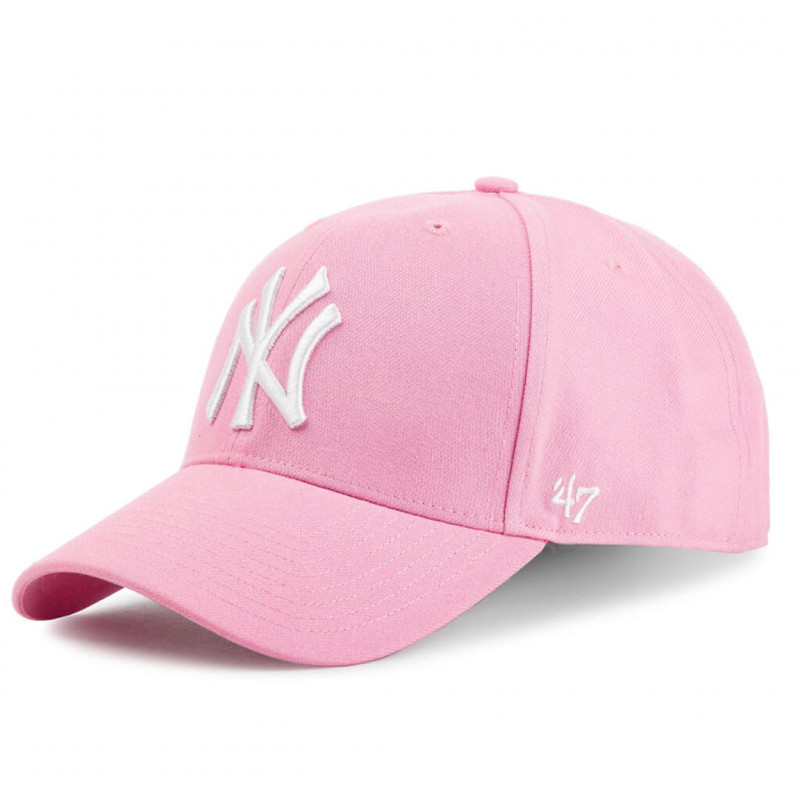 Розовую бейсболку украшают вышитые объемные логотипы бейсбольной команды New York Yankees и производителя 47 Brand белого цвета.