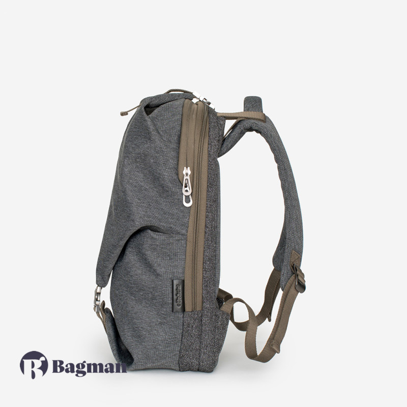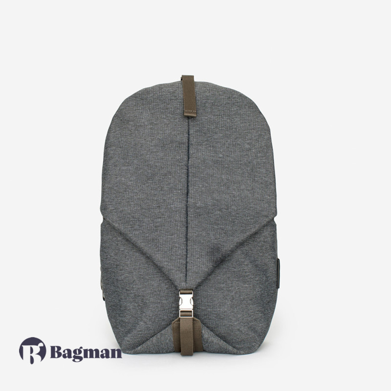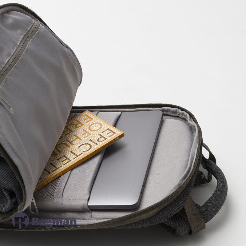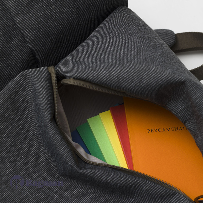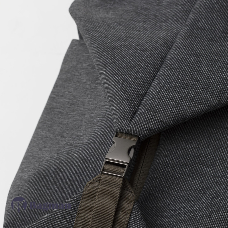 Аксессуар выполнен из серого теплого твидового материала, есть дополнения оливкового цвета, детали из кожи и металла. Отделы закрываются молниями с одним и с двумя бегунками. Рюкзак предоставляет возможность хранения и безопасного перемещения ноутбука с диагональю экрана 13 дюймов. Для гаджета есть отдельный плотный карман внутри. Рядом с ним находится два сетчатых плоских отсека для мелочи и небольшой карман с застежкой на противоположной внутренней стороне. Снаружи рюкзак оснащен карманом для телефона со скрытым доступом.