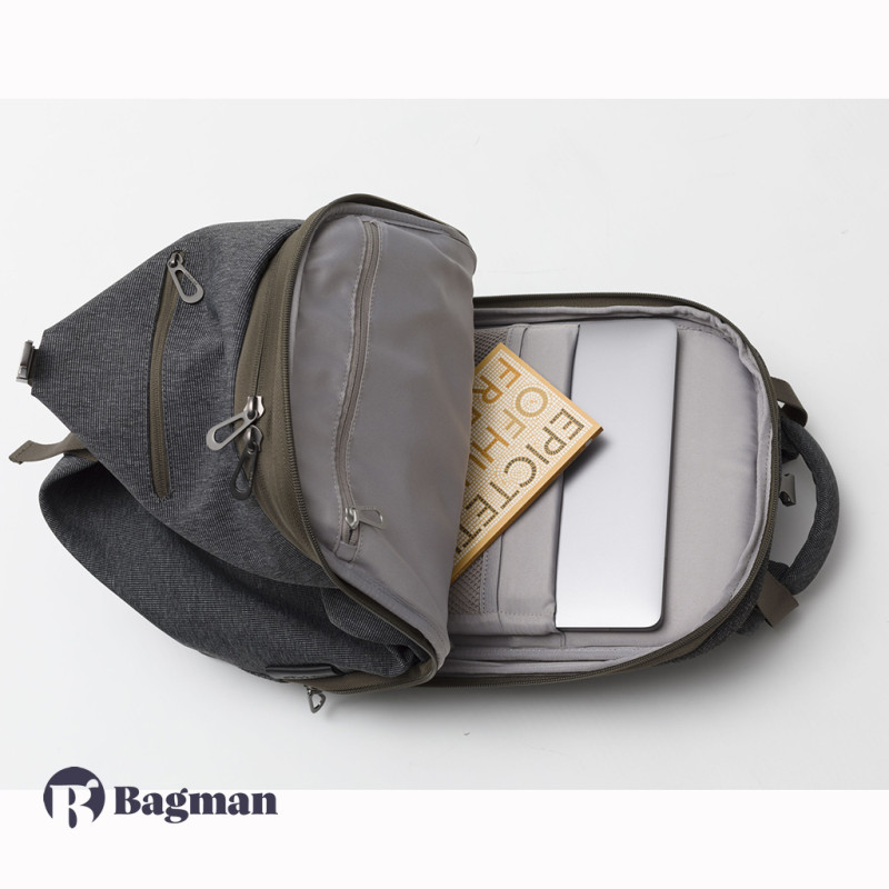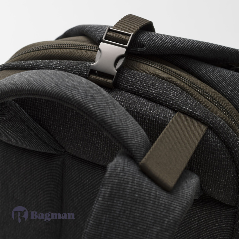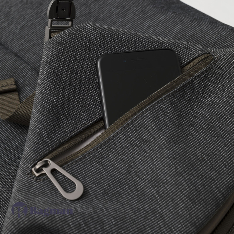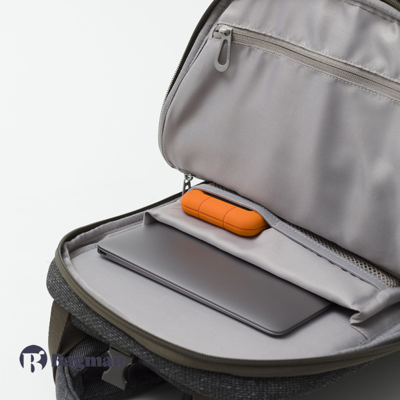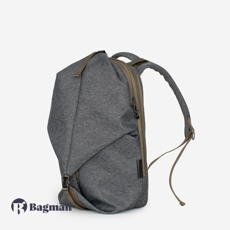 Аксессуар выполнен из серого теплого твидового материала, есть дополнения оливкового цвета, детали из кожи и металла. Отделы закрываются молниями с одним и с двумя бегунками. Рюкзак предоставляет возможность хранения и безопасного перемещения ноутбука с диагональю экрана 13 дюймов. Для гаджета есть отдельный плотный карман внутри. Рядом с ним находится два сетчатых плоских отсека для мелочи и небольшой карман с застежкой на противоположной внутренней стороне. Снаружи рюкзак оснащен карманом для телефона со скрытым доступом.