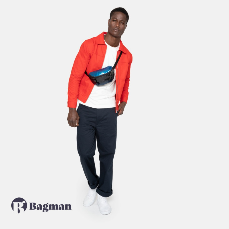 Классическая поясная сумка с одним отделением. Выполнена из полиэстера с лакированным покрытием, по которому капли влаги стекают и не попадают внутрь. Черно-синяя расцветка переливается разными оттенками. Идеально подойдет для всех ваших приключений. Задний кармашек на молнии защитит все ваши ценные вещи.