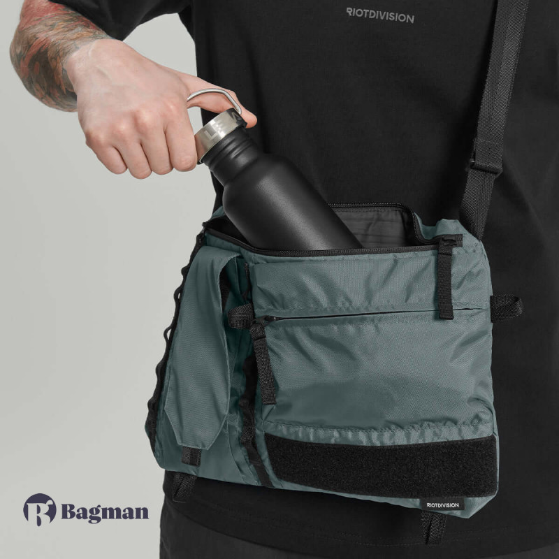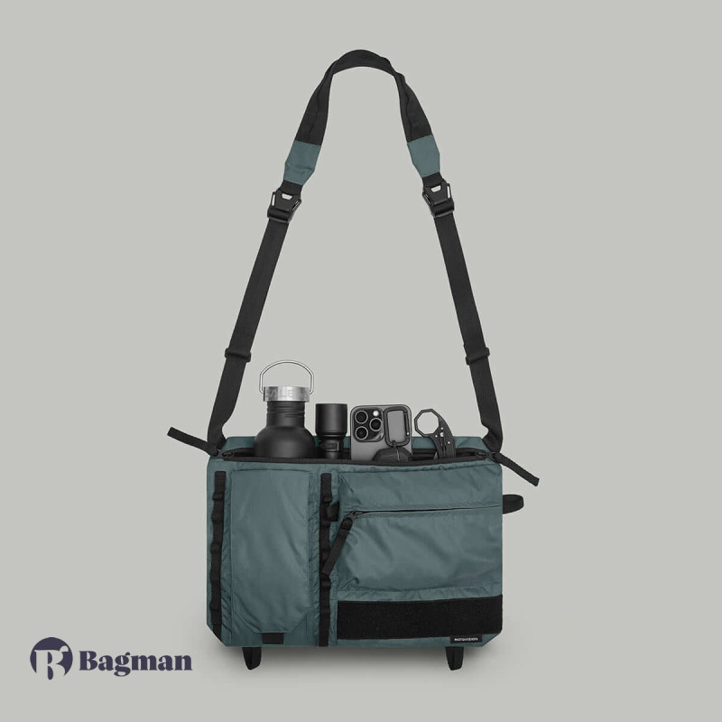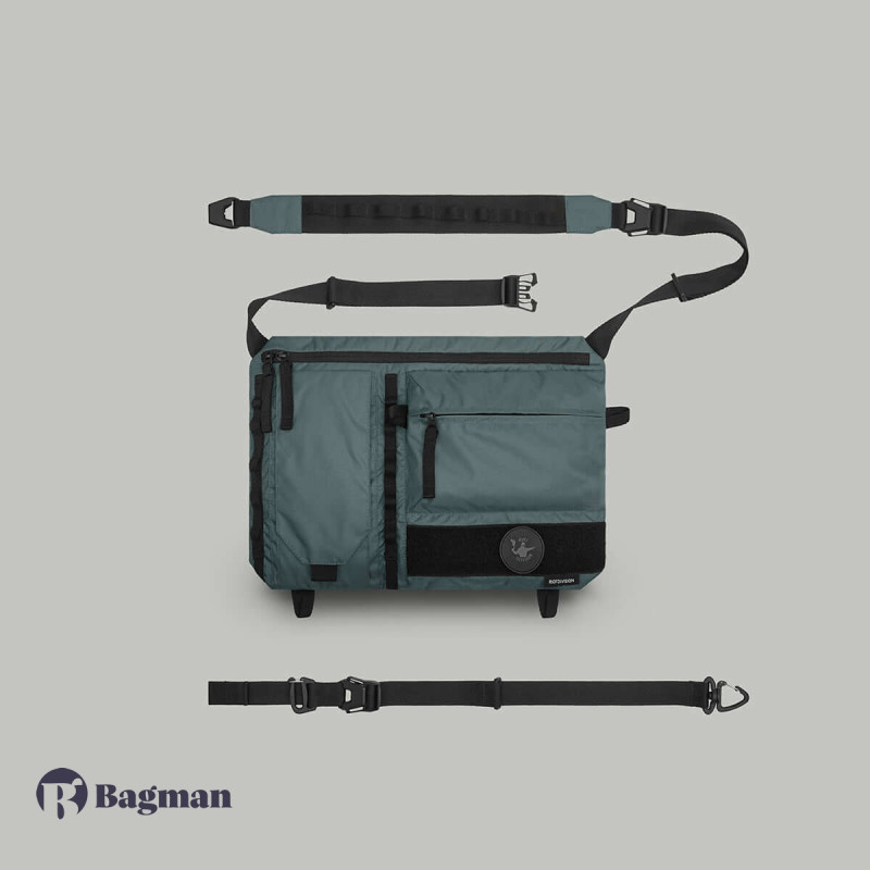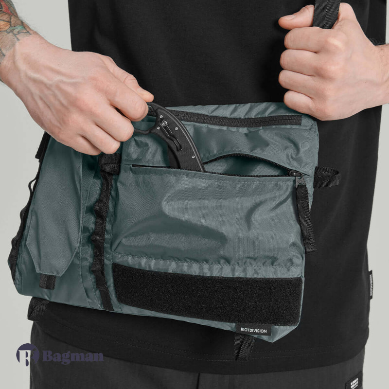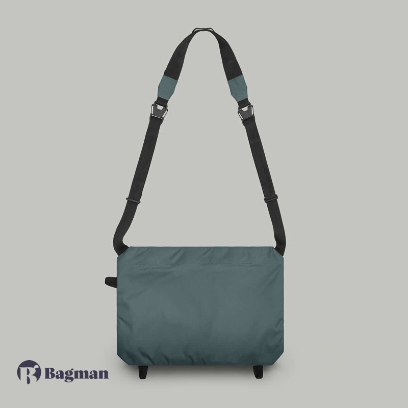 Сумка середнього розміру через плече, виготовлена з вологостійкого нейлону. Вміщує планшет, 13" лептоп та інші необхідні речі.