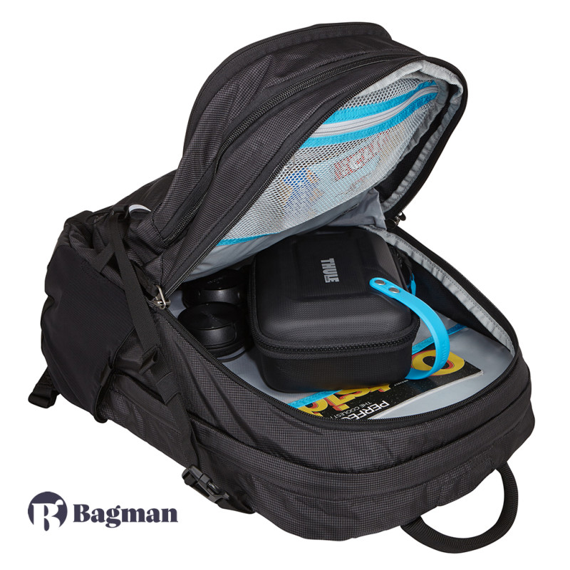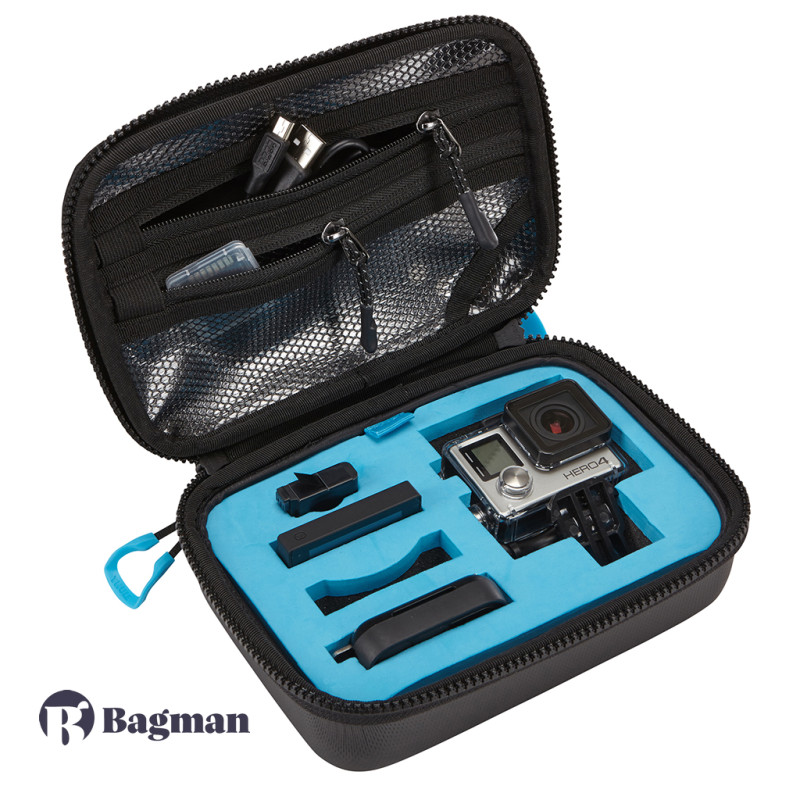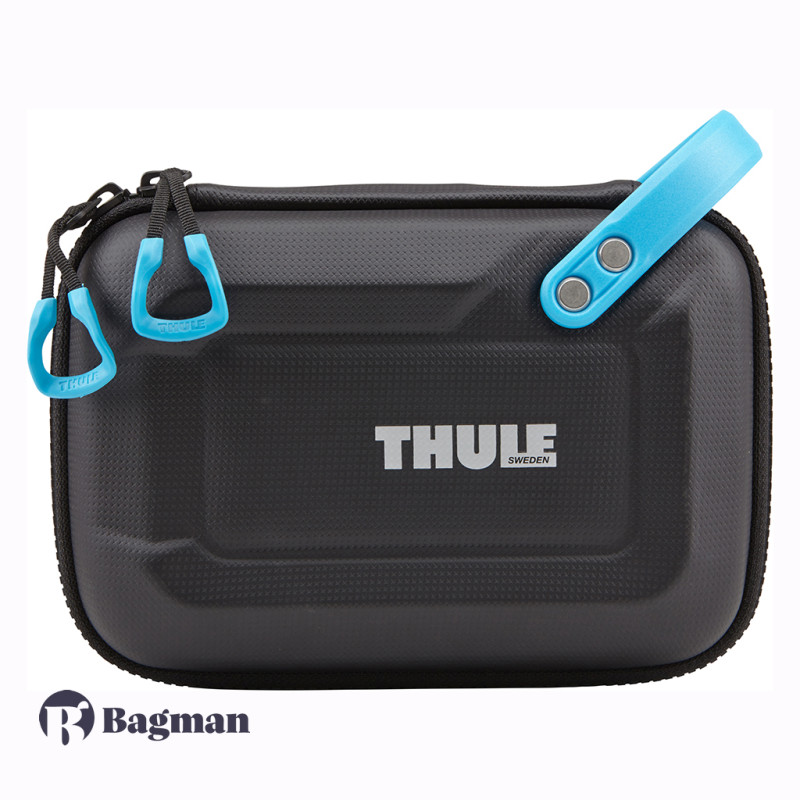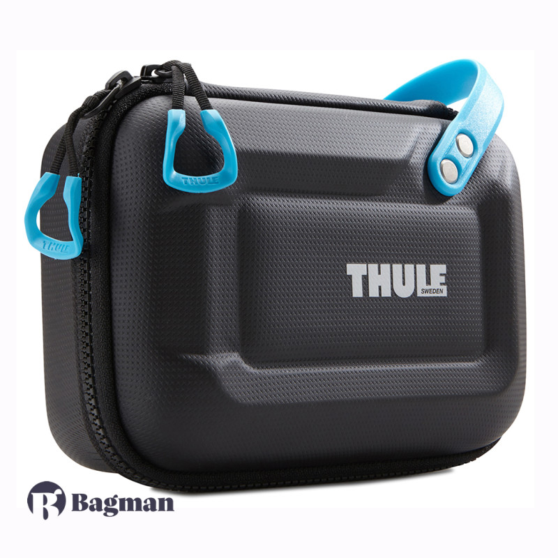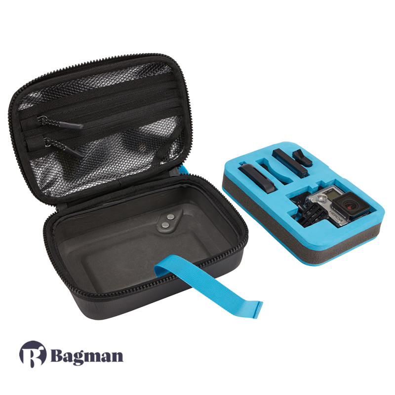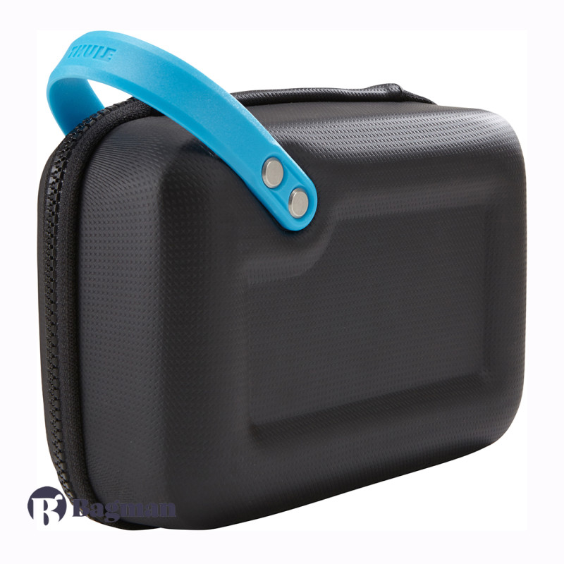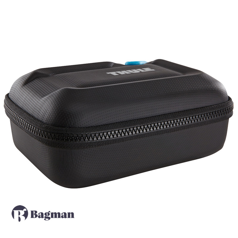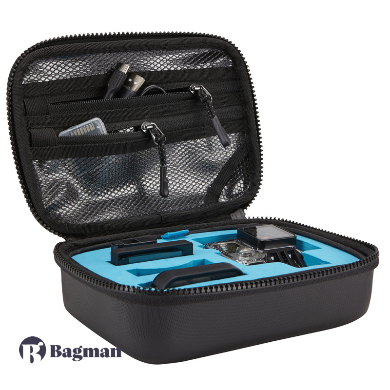 Кейс Thule для камеры GoPro спроектирован для размещения в нем одной камеры и дополнительных ее аксессуаров. Внутрь изделия вставляется специальная вставка с ячейками из прессованной пены. В данные ячейки и помещается все оборудование. Вставку можно изъять из кейса и использовать аксессуар без нее для хранения необходимых принадлежностей. На противоположной части внутри чехла предусмотрены карманы для карт памяти, переходников и других компонентов. Карманы имеют полупрозрачные стенки, через которые просматривается все содержимое.