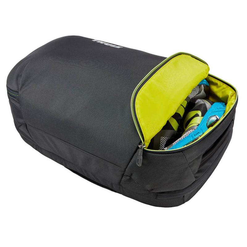 Сумка состоит из вместительного отделения с перегородкой, которой отделяются чистые вещи от грязных, одежда от обуви и так далее. Для ноутбука, планшета, смартфона, электронной книги и других гаджетов есть отдельная сумка с ремнем, которая может находится внутри сумки-рюкзака или использоваться отдельно от нее.