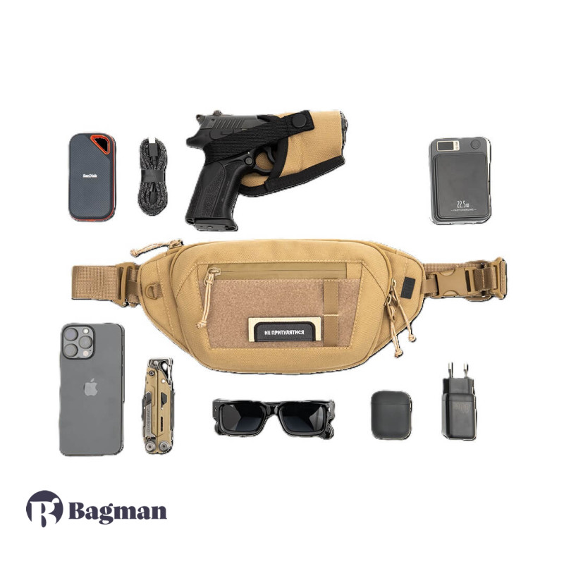 Всепогодна поясна/кросбоді-сумка із прихованим відсіком для носіння особистої зброї і додатковими кишенями для зручного зберігання дрібних речей і гаджетів