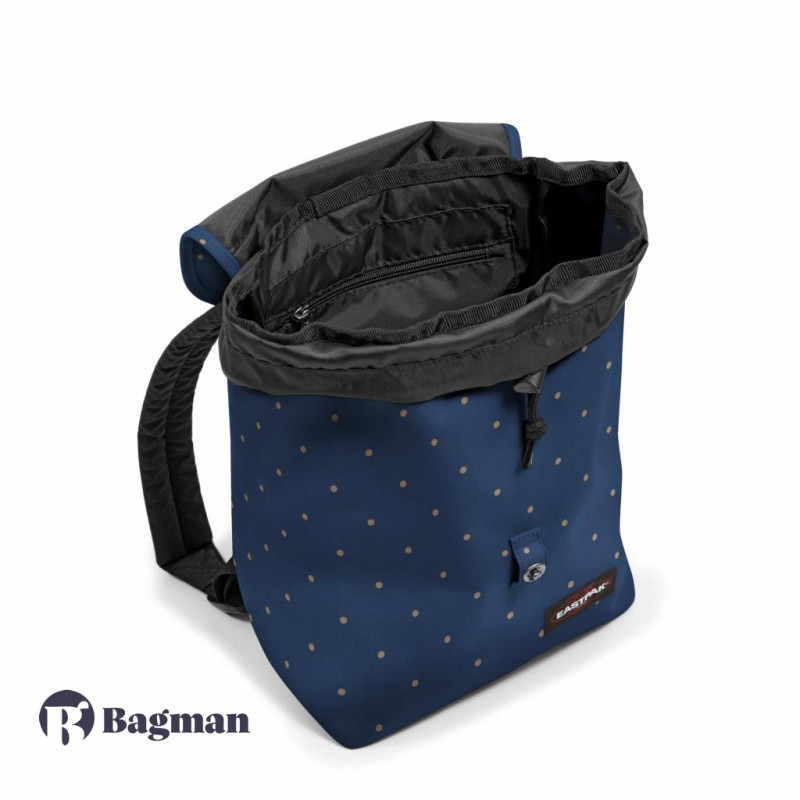 Рюкзак имеет внутренний объем всего 10,5 литров, его форма ровная без наружных накладных карманов. Состоит он из единственного отделения, которое затягивается шнуром и накрывается клапаном. Клапан в свою очередь пристегивается металлической кнопкой на кожаном ремешке. Само изделие изготовлено из полиамида. Материал защищен от промокания под дождем. На темно-синем фоне присутствует узор в точку.