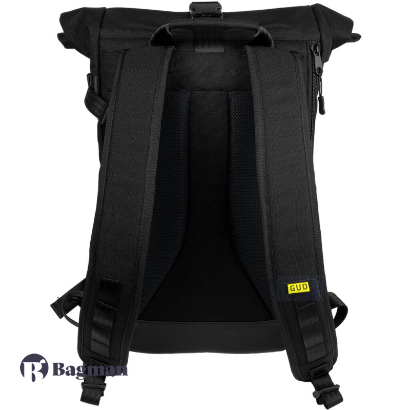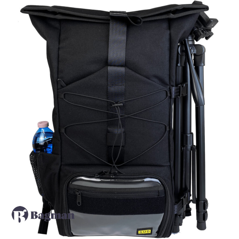 GUD Rolltop DSLR PRO Black — це оновлена модель рюкзака для фотоапаратури від українського виробника. Його особливістю є можливість закріпити дрон у розкладеному положенні на фронтальній поверхні. Еластичний шнур спереду призначений для утримання велосипедного шолома або інших об'ємних речей.