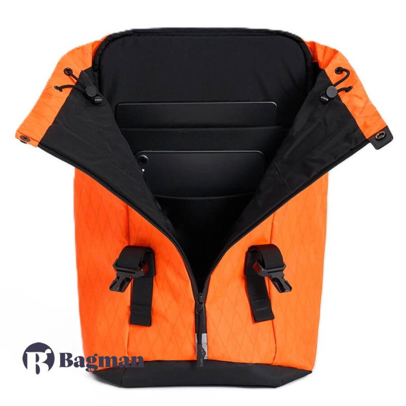HURU 65°64° — міський рюкзак, що вирізняється своєю яскравою індивідуальністю, оригінальною формою та надзвичайною комфортністю для повсякденного використання. Вміщує базовий набір речей, а також ноутбук, зарядні пристрої, книгу, пляшку для води, гаманець та ключі. V-подібний замок розміщений по всій довжині для зручного відкриття. Основне відділення має місце для ноутбука, планшета, і ще дві зручні бокові кишені всередині