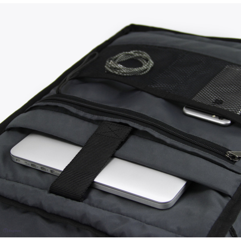Основное отделение с быстрым доступом к ноутбуку до 15 дюймов, внутренний органайзер с клипсой для ключей, резинка для бутылки с водой или термочашки. На спинке рюкзака есть секретный карман для ценных вещей, также два внешних кармана сбоку.