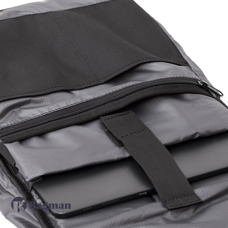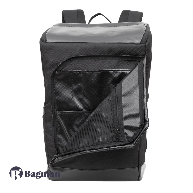 Основний відділ містить кишені для дрібниць з відкритим верхом і з блискавкою, відсік для планшета і окрему захисну кишеню для лептопу з фіксуючим ременем і липучкою. Велика передня кишеня всередині має додаткові відсіки, що формують собою органайзер. З боків у рюкзака знаходяться відсіки для води в пляшках. Закривається рюкзак кришкою, в якій також є кишеня.