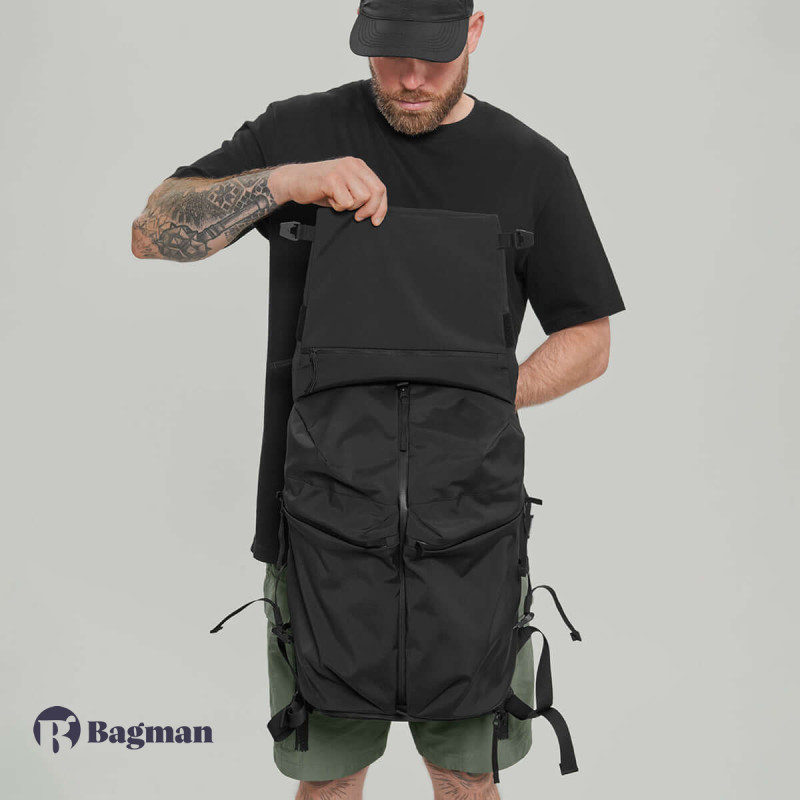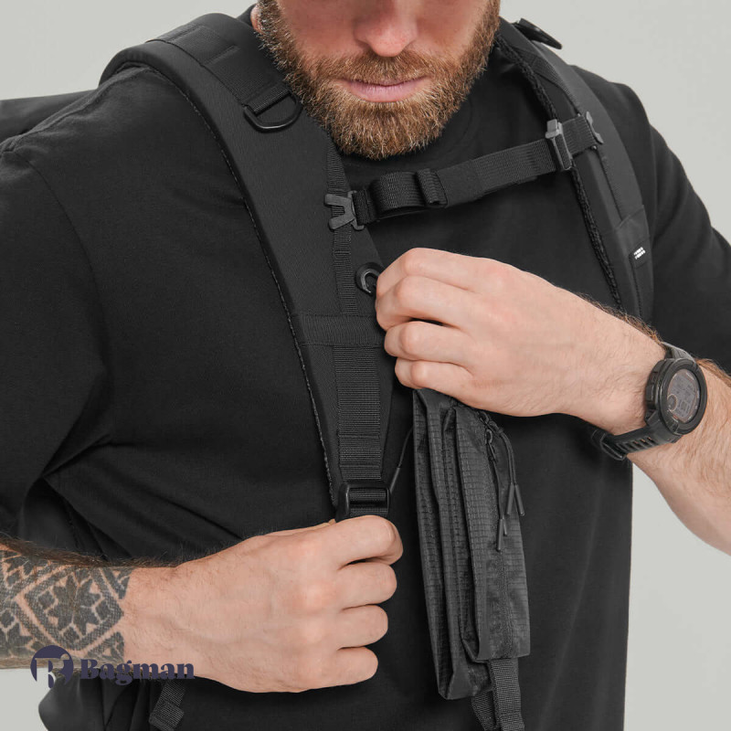 Рюкзак пошитий з водонепроникного нейлону. Товста спинка має вентильовану поверхню. Всі зовнішні відділення застібаються водонепроникними блискавками. Використовується якісна фурнітура YKK, WOOJIN, ARTA. Плечові лямки анатомічної форми і нагрудний ремінь надійно і зручно фіксують рюкзак на спині.