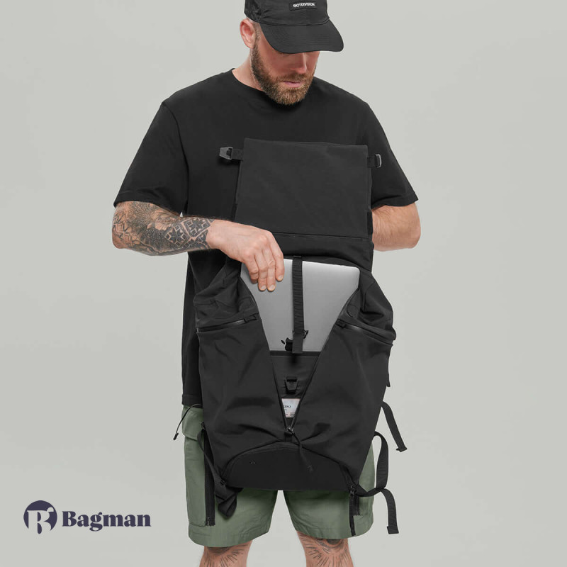 Вертикальна передня блискавка відкриває доступ до основного відділення. Всередині є окремий відсік для 15-дюймового ноутбука. Знизу передбачена окрема кишеня для взуття.