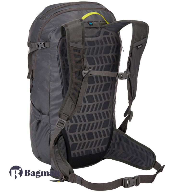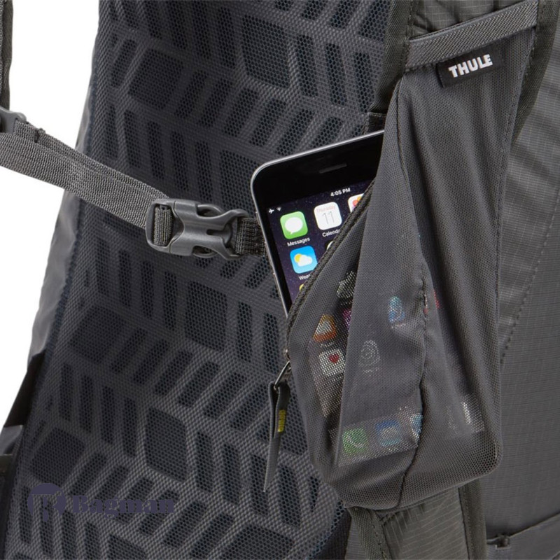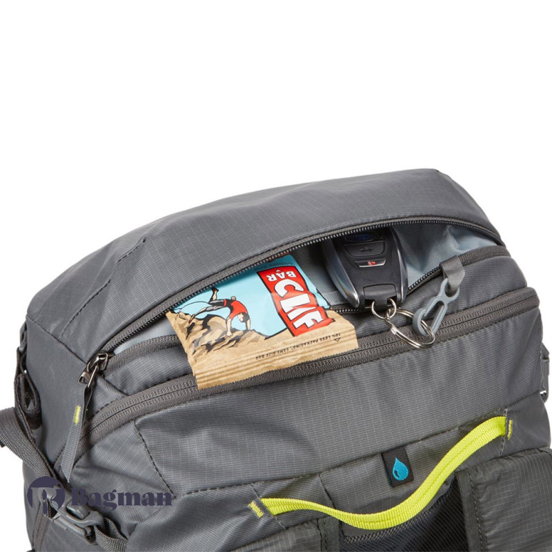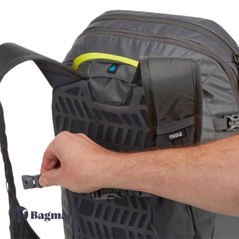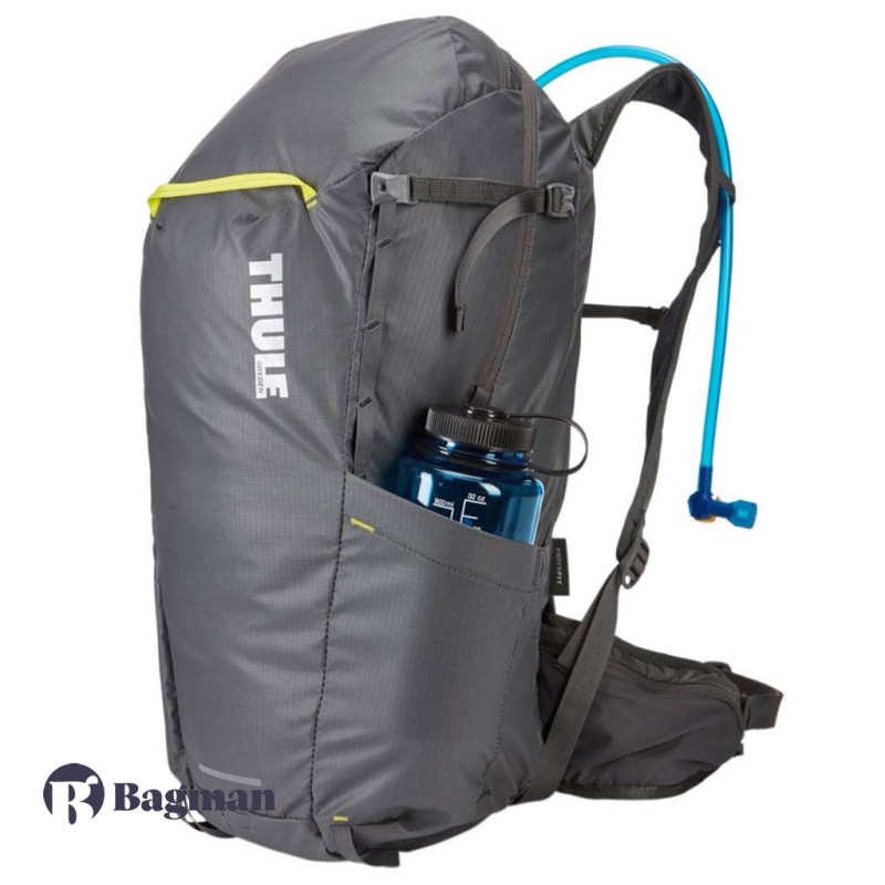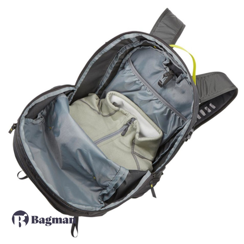 Для упаковки всех основных вещей предусмотрен отдел на молнии. В нем находится отделение для емкости с водой, ее трубка выводится на поверхность через специальное отверстие. Бутилированная вода укладывается в боковые эластичные карманы. Рюкзак имеет небольшой карман вверху для мелких принадлежностей. В нем также есть клипса для ключей. Эластичный карман на плечевом ремне удобен для мобильного телефона.