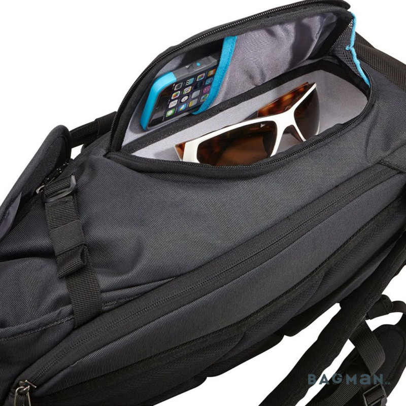 Внутри есть отделение для MacBook и отдельный карман с уплотненной подкладкой для планшета. Доступ к этим гаджетам можно осуществить с боковой панели. Отделение застегивается молнией, предоставляя полный обзор содержимого и удобное наполнение рюкзака необходимым инвентарем. Зарядное устройство для ноутбука будет удобно поместить в передний карман. Для мелких принадлежностей предусмотрен органайзер с необходимыми отсеками. Боковое отделение для очков и телефона снимается при желании.
