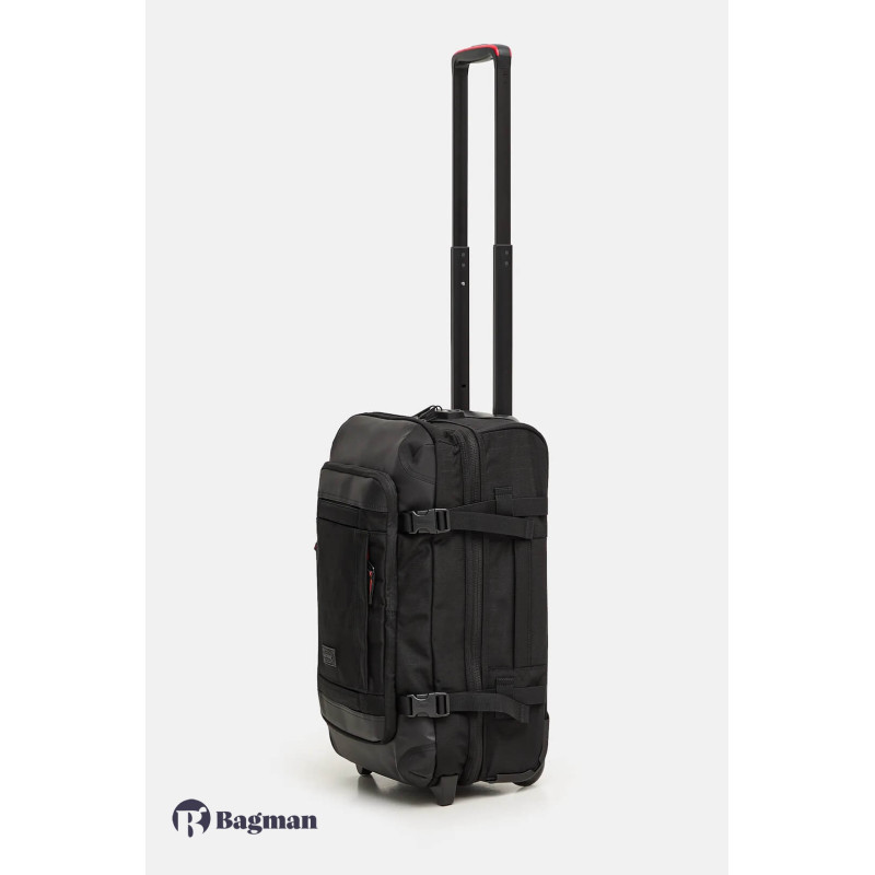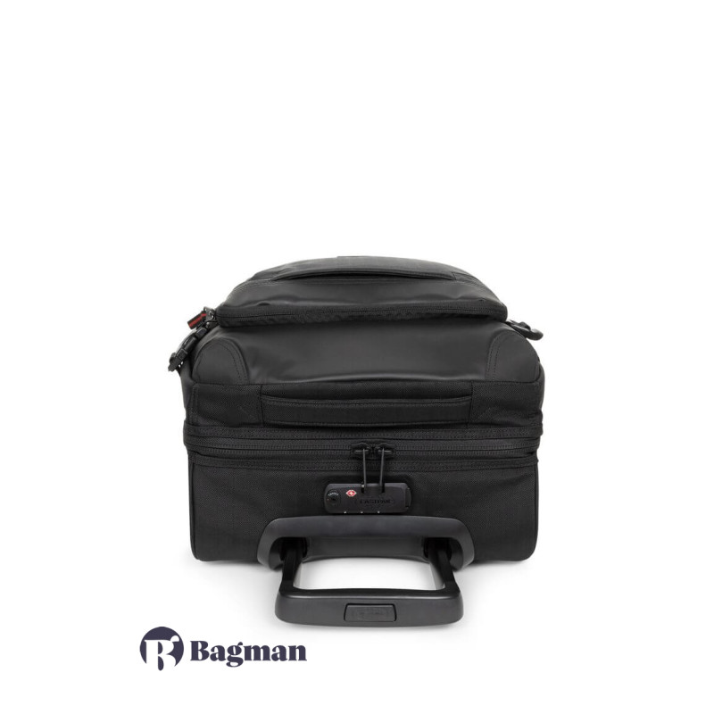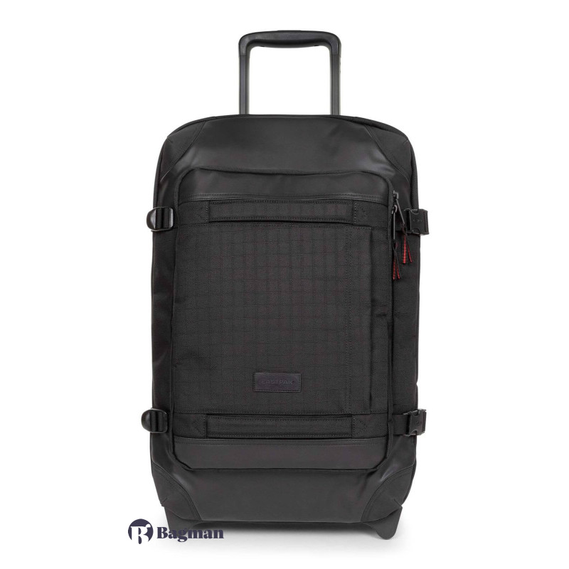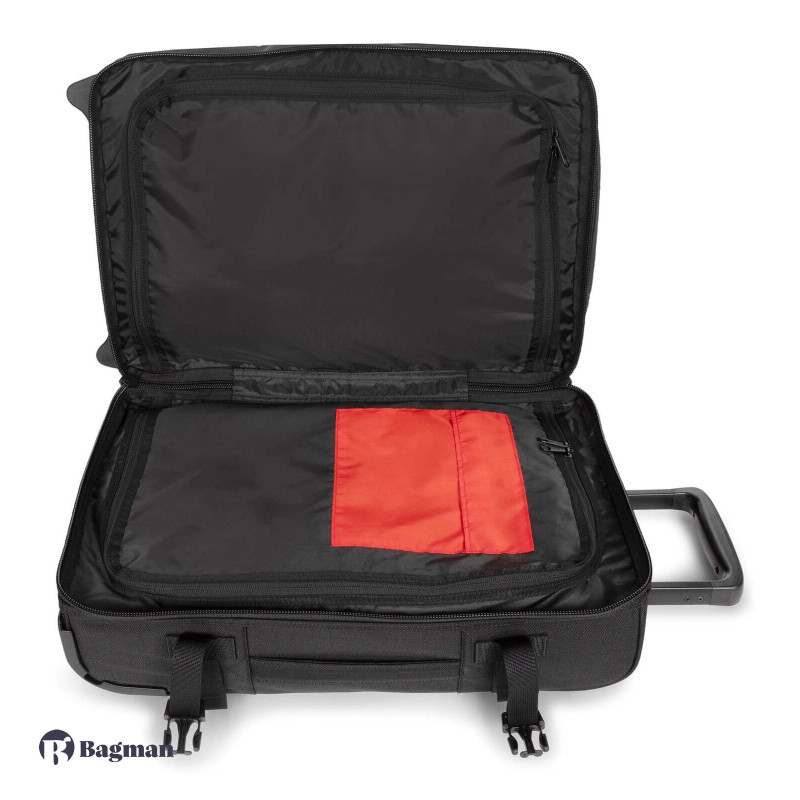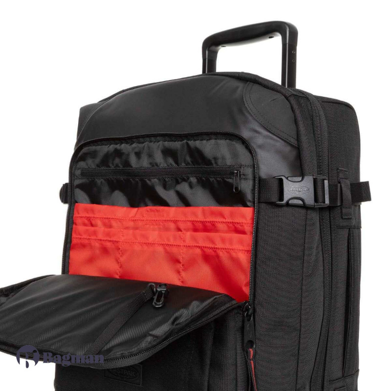Eastpak TRANVERZ S - це дорожня валіза, яка підходить для ручної поклажі. Модель має гібридний корпус: спереду валіза м'яка, а задня сторона має міцний каркас. Виготовлено валізу зі зносостійкого поліестеру. Валіза має два колеса. Для стійкого вертикального положення є спеціальні підставки. Для зручного транспортування багажу передбачена телескопічна ручка і ручка-переноска зверху. З боків у валізи є по два компресійних ременя. Всередині валіза розділена на дві окремі секції. Є невелика внутрішня кишеня і кишеня на блискавці зовні. Двоколісна валіза оснащена кодовим замком TSA з тризначною комбінацією та системою плавного ходу коліс.