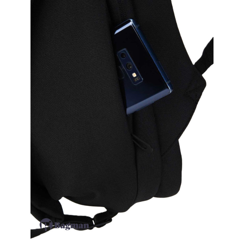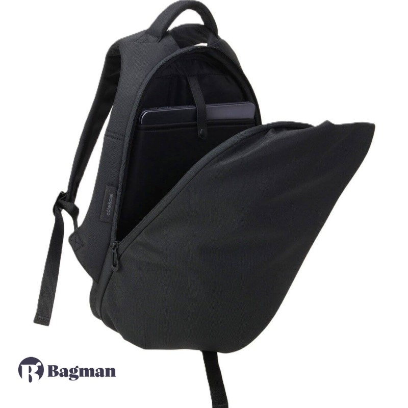 Доступ к основному отделению рюкзака осуществляется не так, как у других рюкзаков. Отделение открывается сбоку и затем загибается и крепится ремешком. Есть отдельный защитный отсек для хранения 13-дюймовых гаджетов. Он расположен у спинки и застегивается водонепроницаемой молнией с двумя замками. Также есть небольшой карман для драгоценностей.