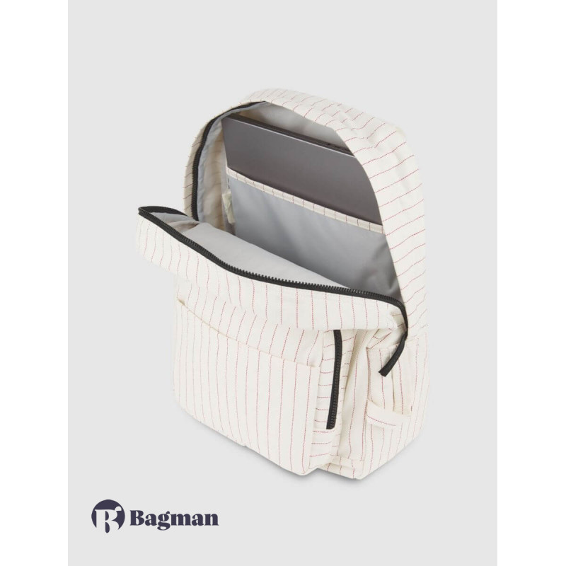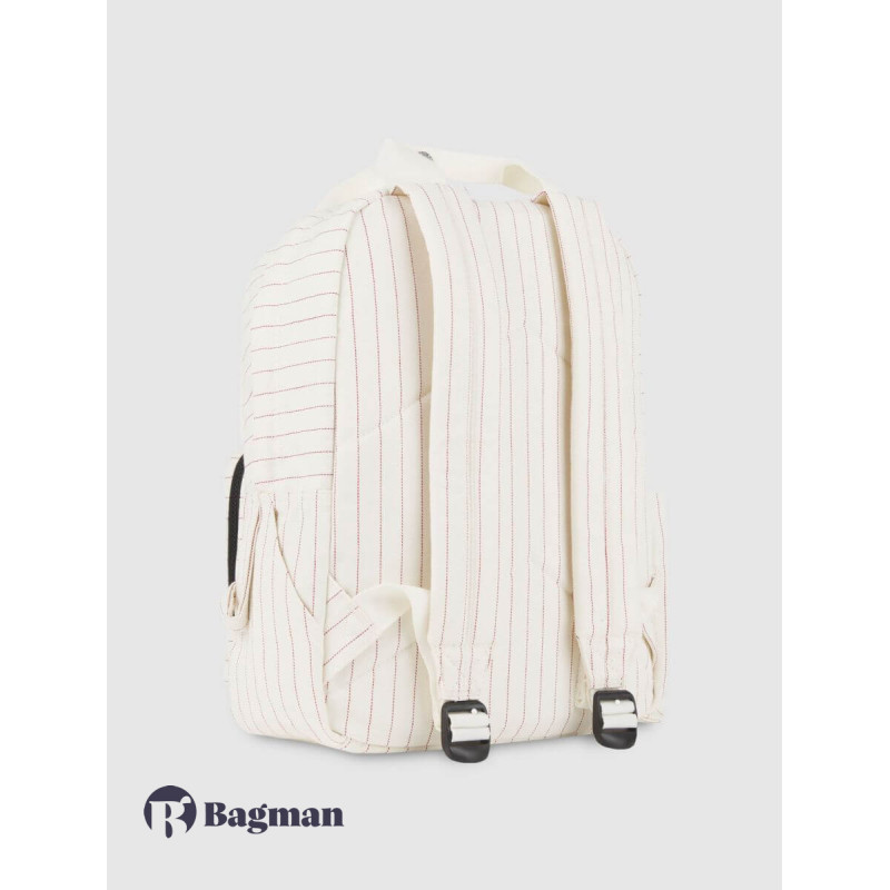 The Dickies backpack consists of a large Rum which opens at the top with a zipper. Inside the compartment there is a padded laptop pocket. In front, there is a smaller zipped pocket, where there are two open pockets on the outside. On the left side there is a slip pocket which is perfect for a water bottle. The Backpack has two handles at the top and there are adjustable, padded shoulder straps.