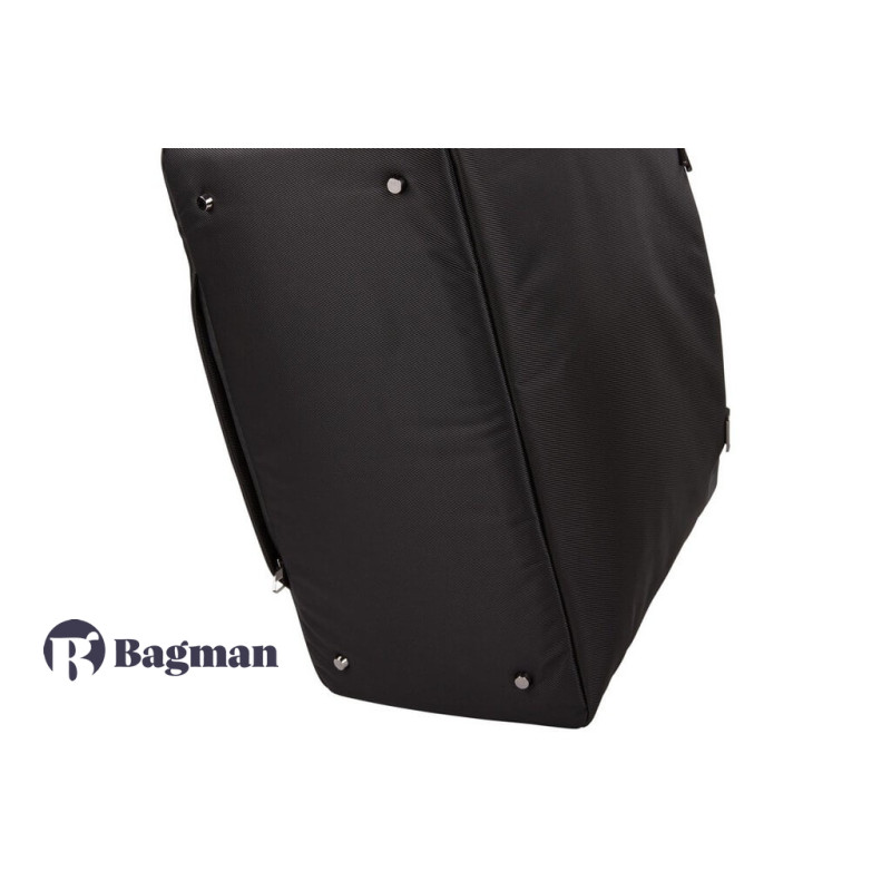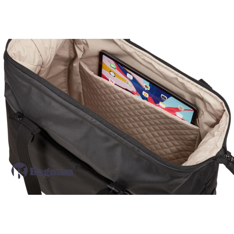 Сумка состоит из одного вместительного отделения с двусторонней застежкой. Кнопками по бокам можно пристегнуть края отделения для более компактной формы. Внутри есть стеганый карман с мягкой подкладкой для планшета. Внешняя часть изделия оснащена двумя небольшими карманами. Один из них превращается в панель для фиксации сумки на чемоданной выдвижной ручке.