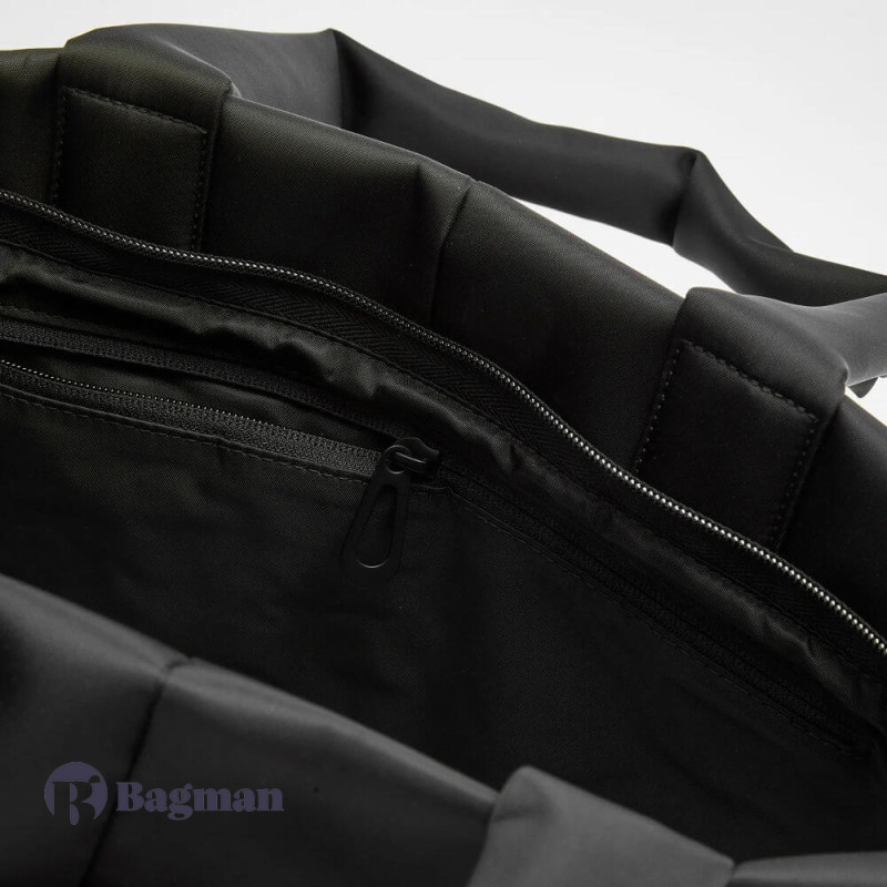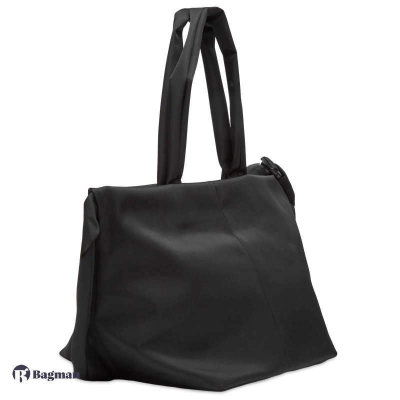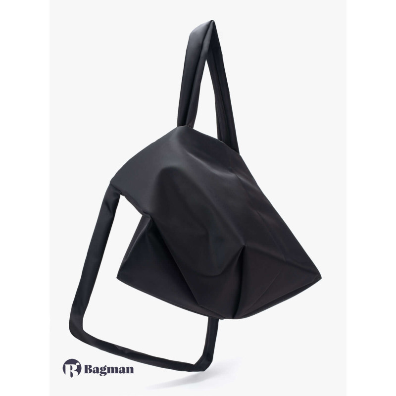 The AMU is a versatile bag that can shape-shift to create different looks. It can be used as a tote, a shoulder bag or across the body. Taking on an exaggerated silhouette, the main body is bigger whereas the carry straps are thinner and more petite. The AMU has a main compartment with an interior security pocket. It is made using ‘Sleek Black’ nylon.