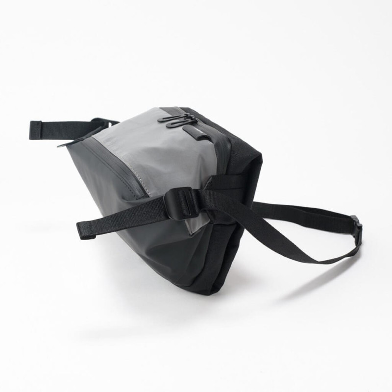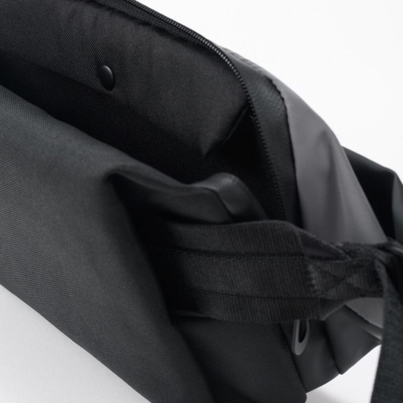 Узкий ремешок сумки регулируется по длине, а остаток фиксируется вдоль ремня специальной вставкой. Сумку можно сделать еще компактнее, если затянуть ремни по бокам.