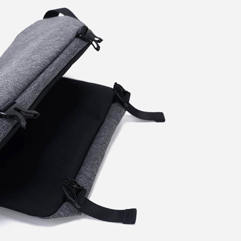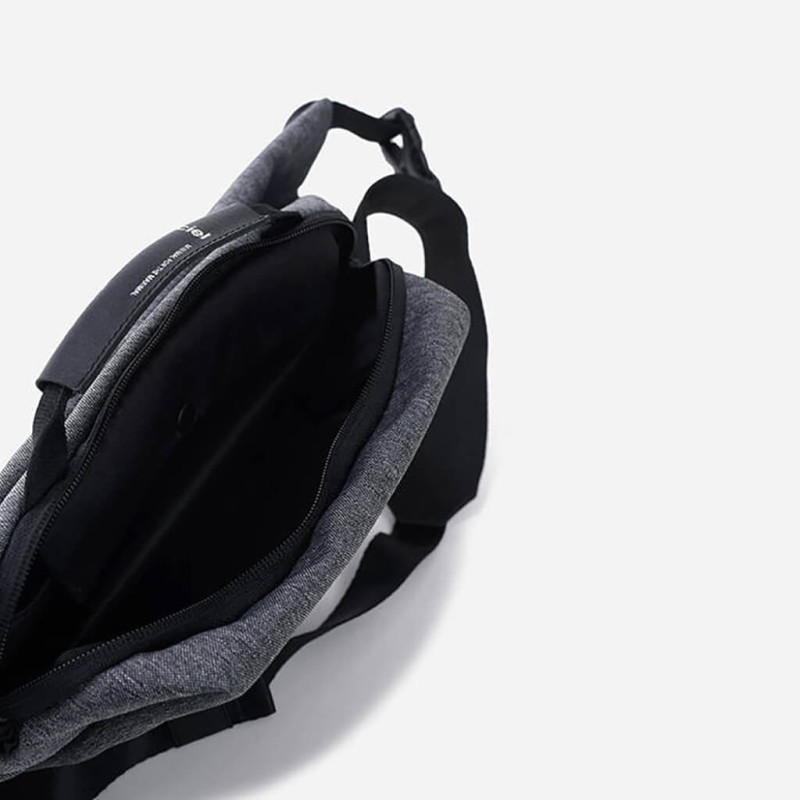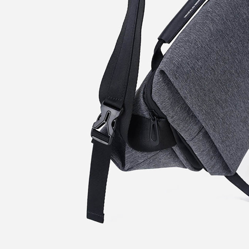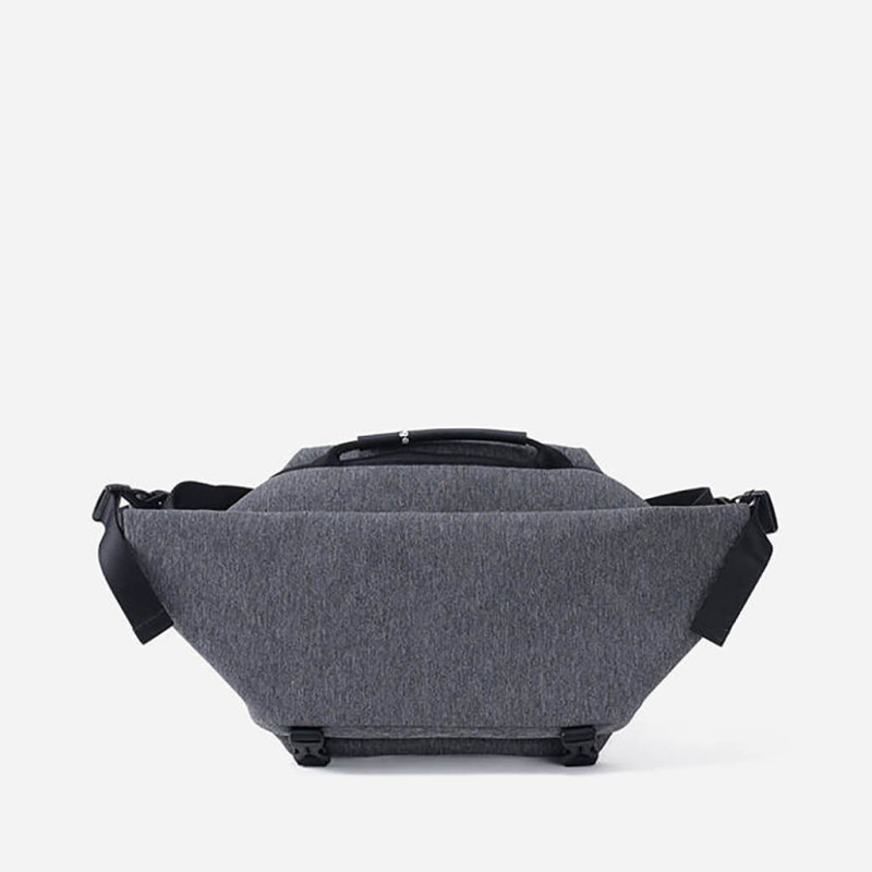 Модель серого цвета изготовлена из переработанного полиэстера и имеет водоотталкивающие свойства. Молнии также не пропускают влагу. Длина плечевого ремня регулируется, а оставшаяся часть фиксируется специальной вставкой. Имеется ручка-переноска сверху.