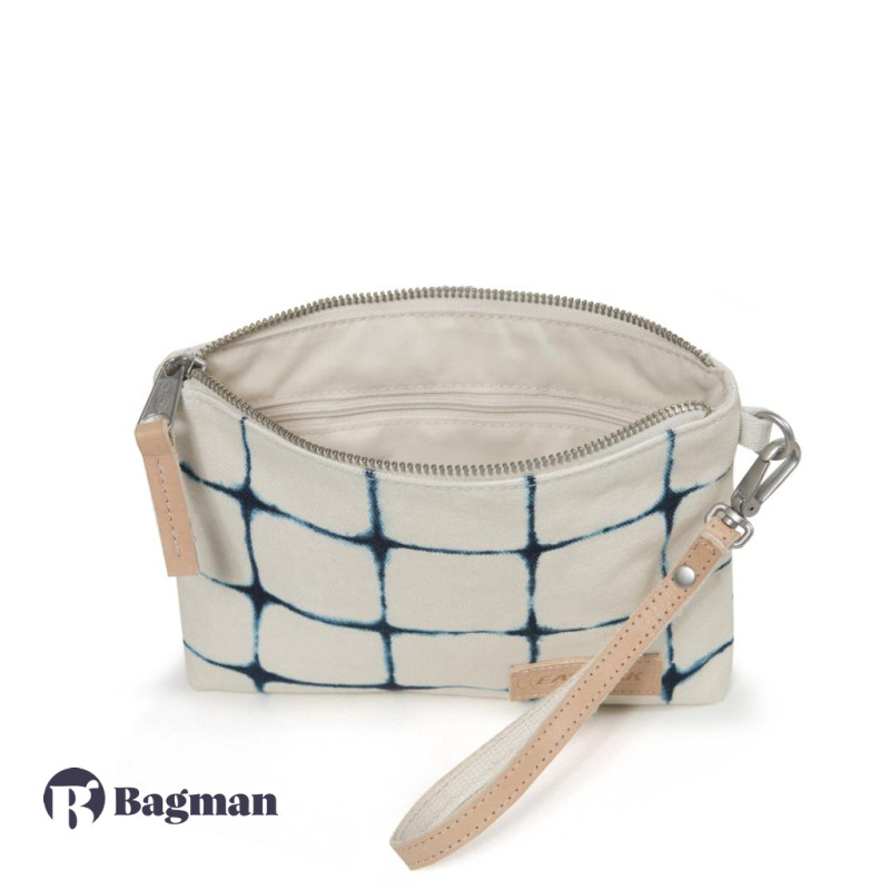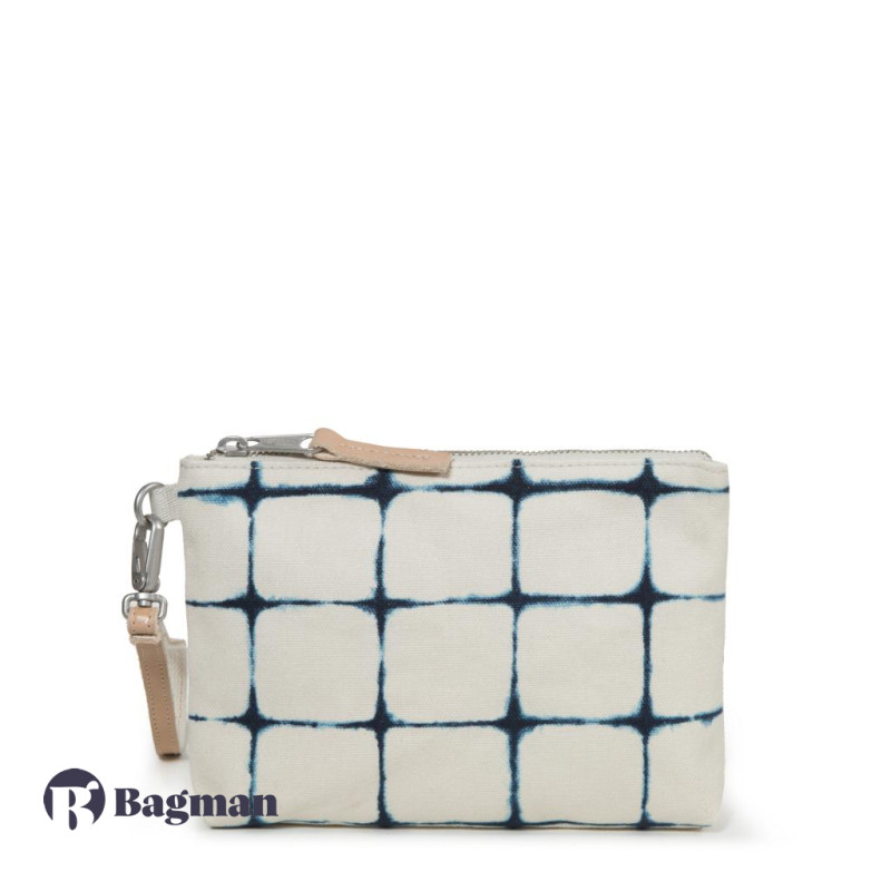 Для удобства носки к аксессуару крепится короткий ремешок, который можно накинуть на руку. Ремешок изготовлен из натуральной кожи, а для крепления используется карабин из металла. Сама сумка изготовлена из качественного хлопка японского производства с дизайном Shibori Square, который был создан по специальной технологии окрашивания ткани.