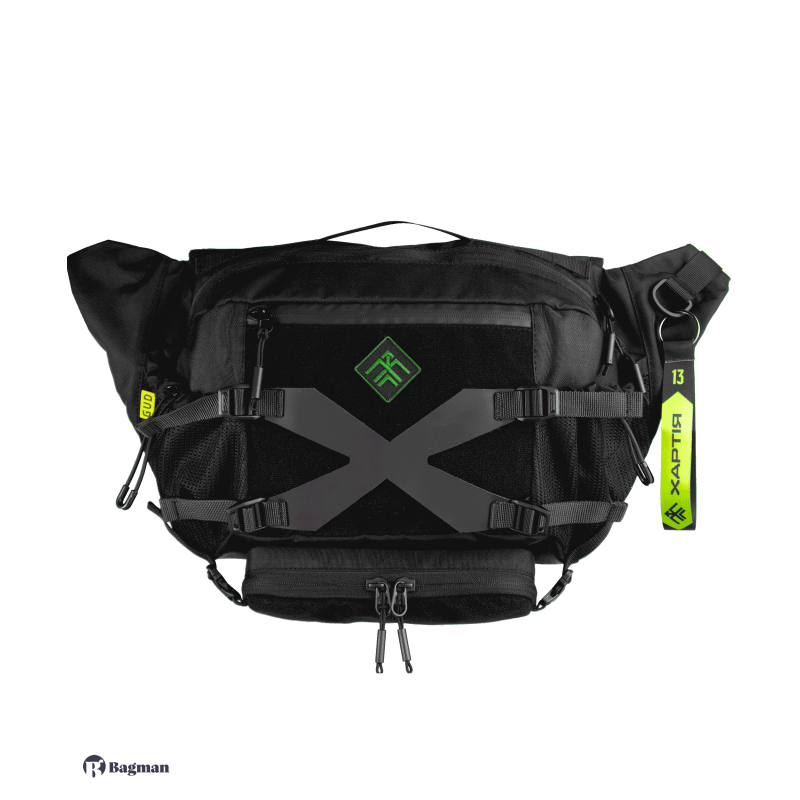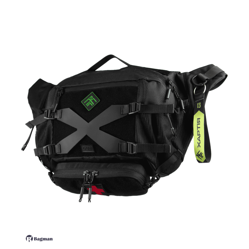 - Великий символ "Х" на передній частині виготовлений із цупкої чорної шкіри і має кріплення, які дозволяють використовувати його для фіксації об'ємних речей зовні