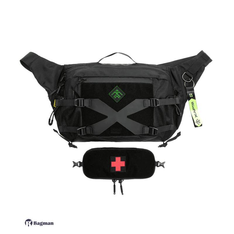 - До комплекту сумки включений підсумок для цивільної аптечки, який можна наповнити за рекомендаціями бойових медиків, які прописані на окремій вкладці всередині