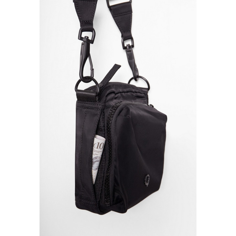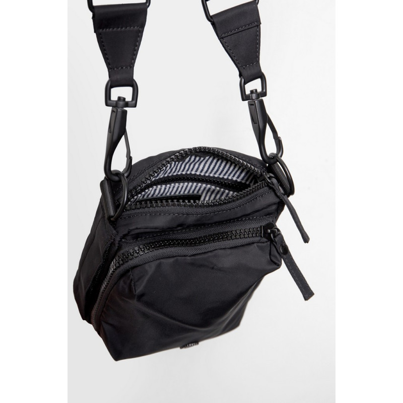 Сумка состоит из главного отделения и дополнительного, которые оба застегиваются молниями. Внутри находятся карманы для отдельного хранения каждой мелочи. Есть карман с застежкой внутри большего отдела. Во втором отделении создано два отсека, один из которых застегивается водонепроницаемой молнией. Сбоку у сумки есть открытый отдел для небольших предметов.