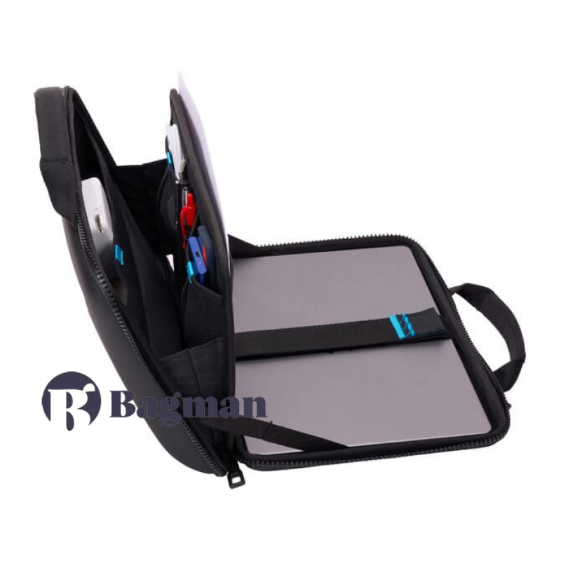 Сумка имеет жесткий полиуретановый корпус, защищающий от ударов и сотрясений со всех сторон. Мягкая внутренняя подкладка не допускает появление на поверхности гаджета царапин и поддерживает его чистоту. Внутри сумки есть отделение с органайзером, которое фиксируется широкой лямкой. Два боковых ремешка удерживают сумку в полуоткрытом положении, чтобы за ноутбуком можно было работать не вытаскивая его полностью из сумки.