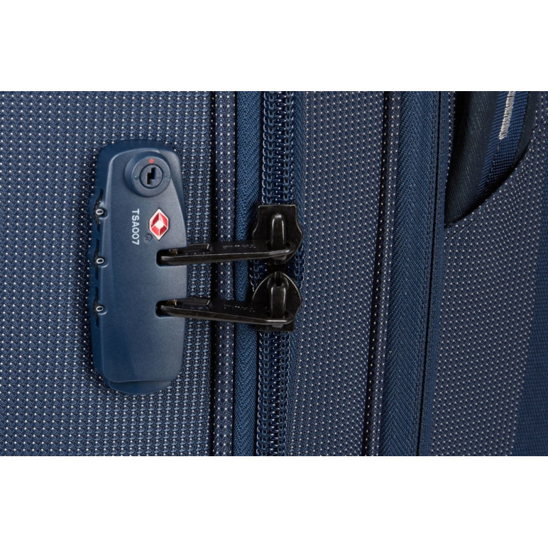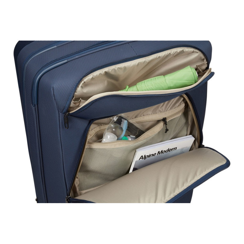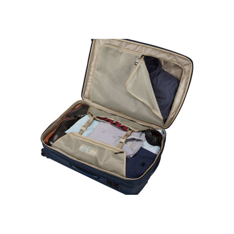 Валіза складається з місткого відділення для одягу та взуття. Речі в ньому фіксуються компресійними панелями. На них розташовані невеликі кишені з блискавками. Усередині також передбачений відсік на застібці для окремого зберігання речей. Є передні відділення. Щоб не зменшувати внутрішній простір валізи розмір передніх коліс був зменшений.