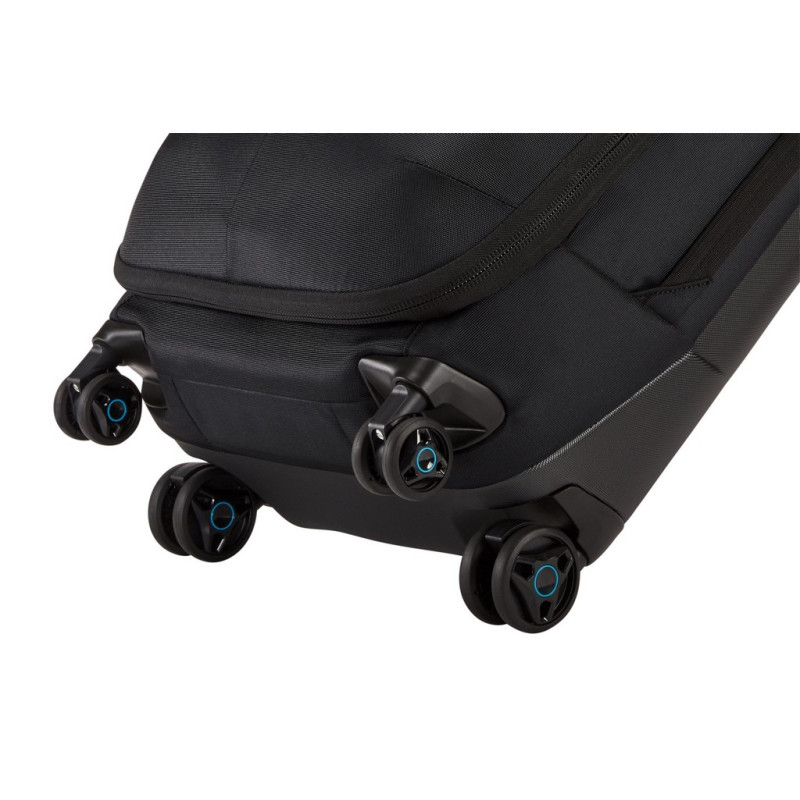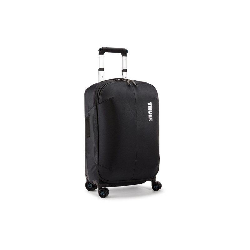 Thule Subterra Carry-On Spinner Black — це проста в управлінні дорожня валіза, яка відповідає розмірам ручної поклажі. Валіза має жорстку задню стінку з полікарбонату і м'яку передню частину. Чотири подвійні колеса забезпечують плавність руху. Розмір передніх коліс зменшений, що дозволяє збільшити внутрішній простір і взяти більше речей.