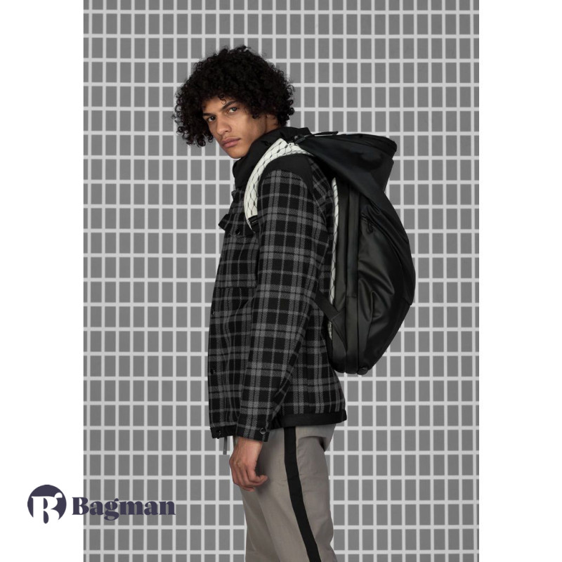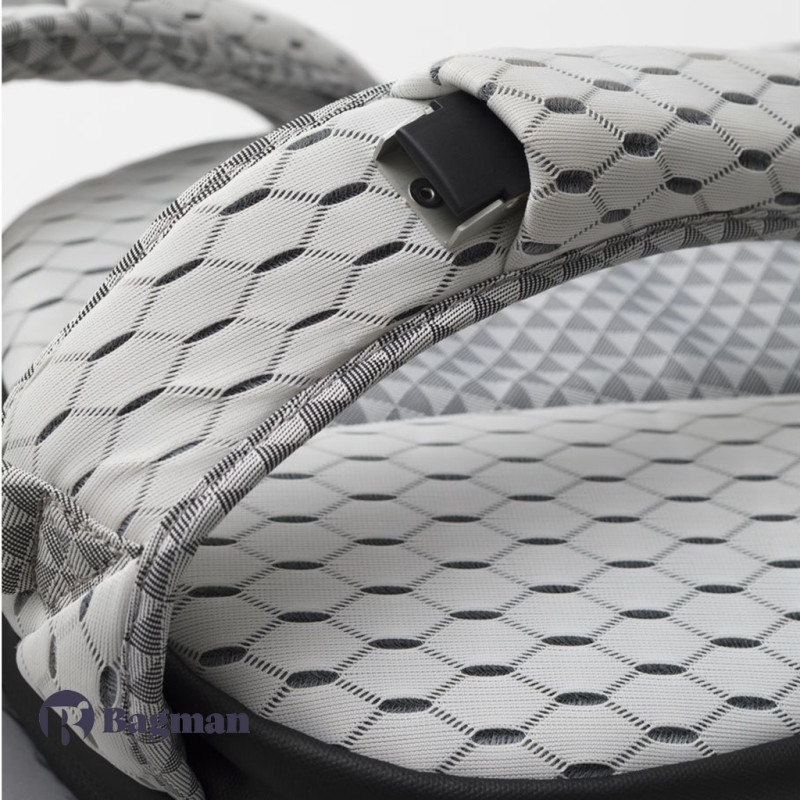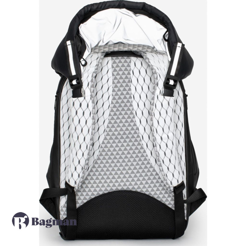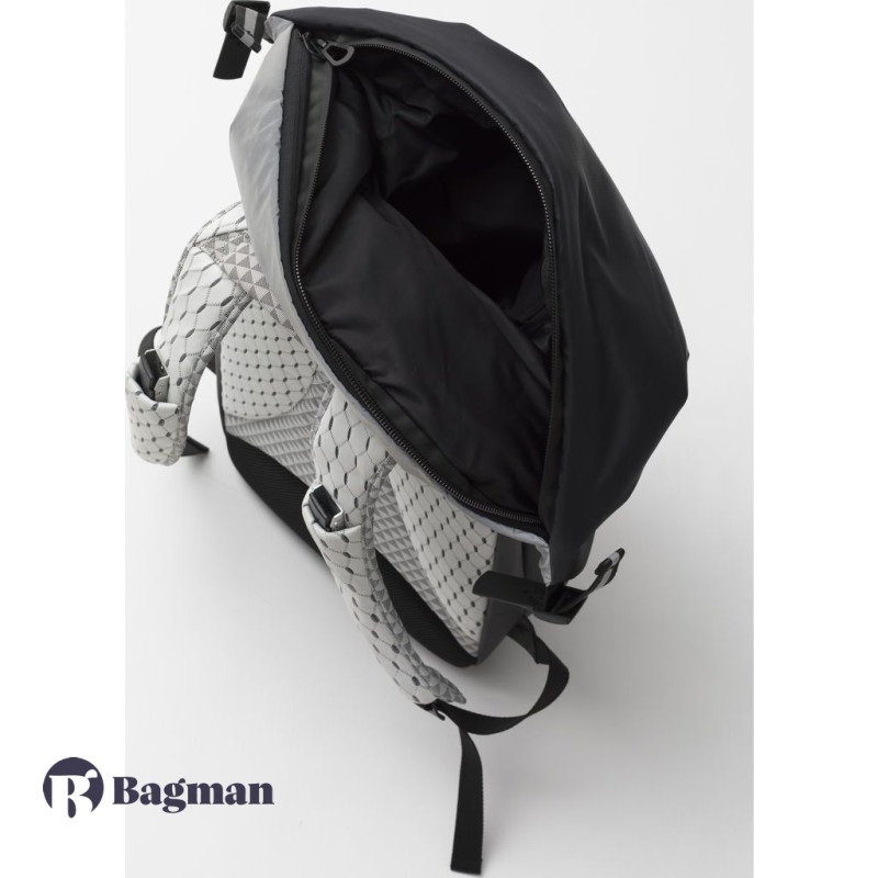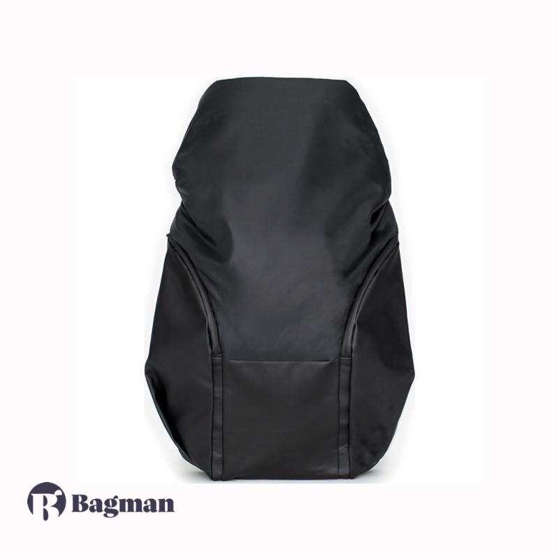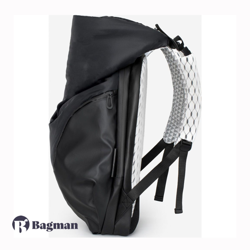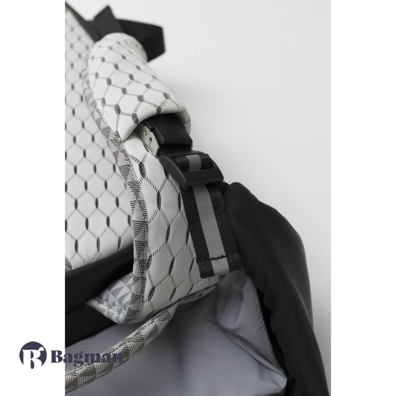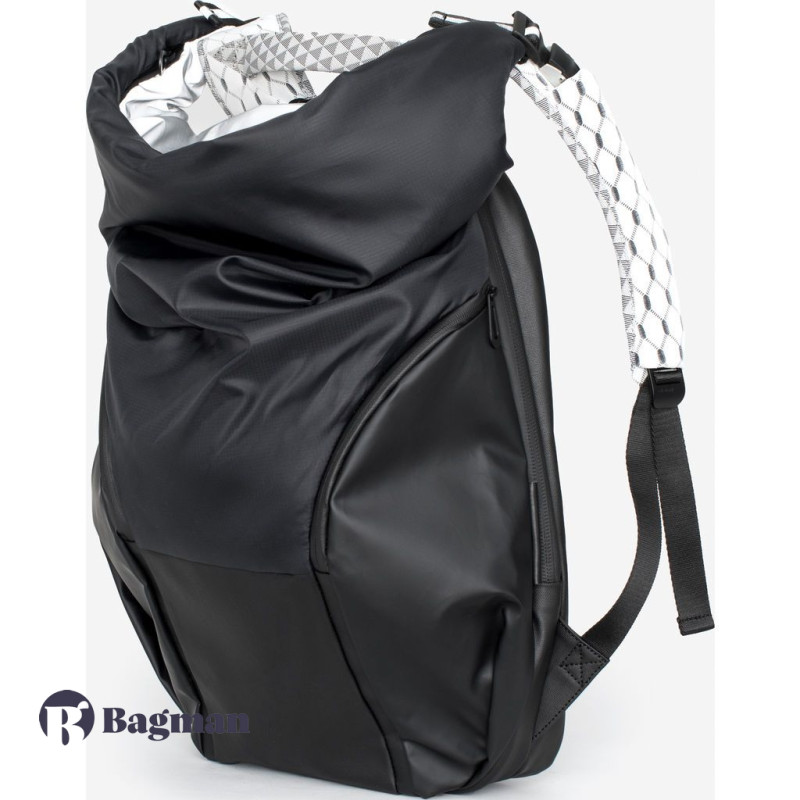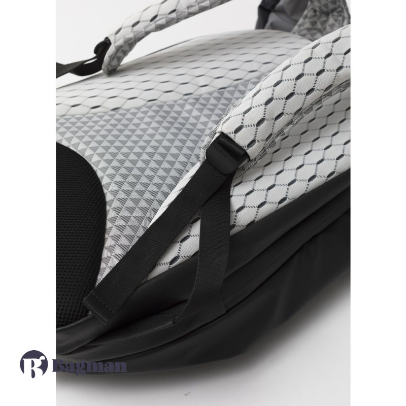 Рюкзак у формі кокона Nile Mimas Black виготовлений з декількох видів легких тканин, які мають водонепроникні характеристики. Передня сторона виконана в чорному кольорі, а задня сторона разом з рюкзачними лямками в білому кольорі з геометричним принтом. У рюкзака є елементи сірого кольору, які змінюють відтінок залежно від кута огляду та освітлення, також є шкіряні та металеві елементи.