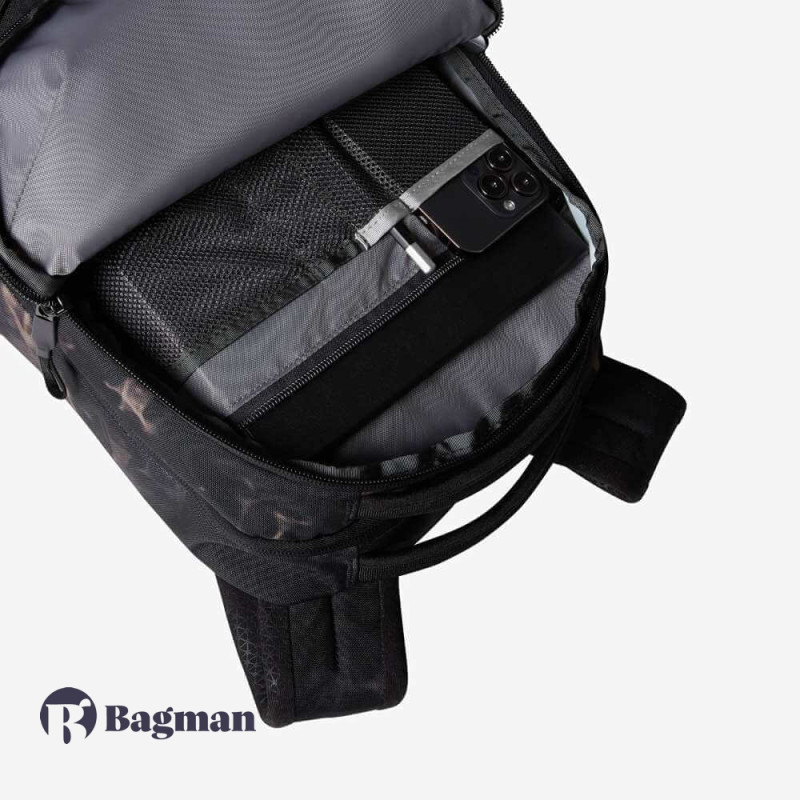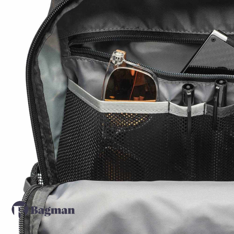 - Переднє відділення спрощує організацію для сучасного користувача, зберігаючи при цьому важливі функції для зберігання, такі як кишені на блискавці, чохол для планшета та кріплення для ключів.