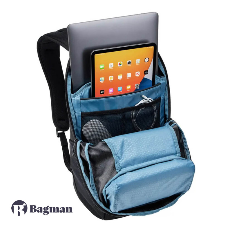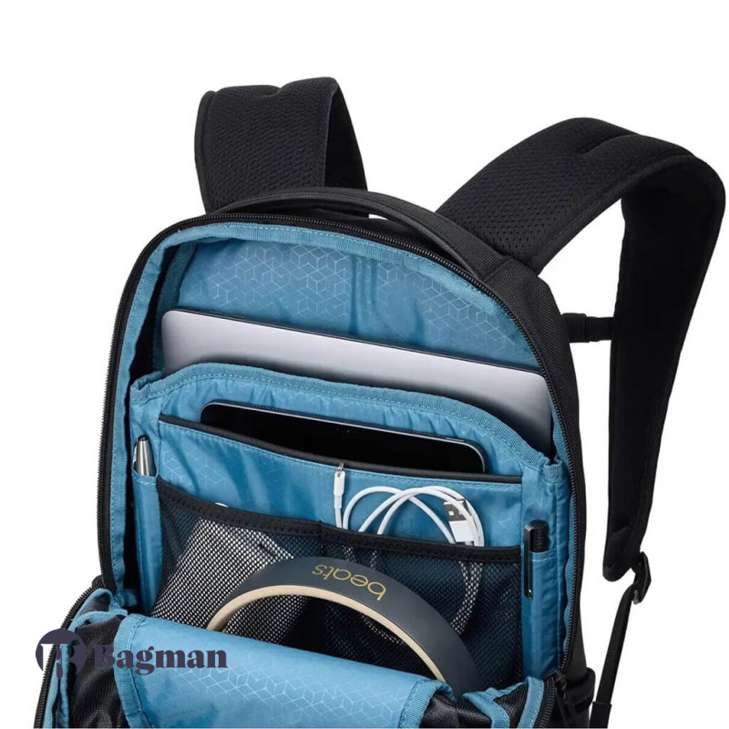 Основне відділення оснащене окремими кишенями для планшета розміром 10,5 дюймів і макбука розміром 16 дюймів або іншого 14-дюймового ноутбука. У рюкзаку багато кишень різного розміру для організованого зберігання речей. У бічних еластичних кишенях зручно носити пляшки з водою або різні дрібниці.