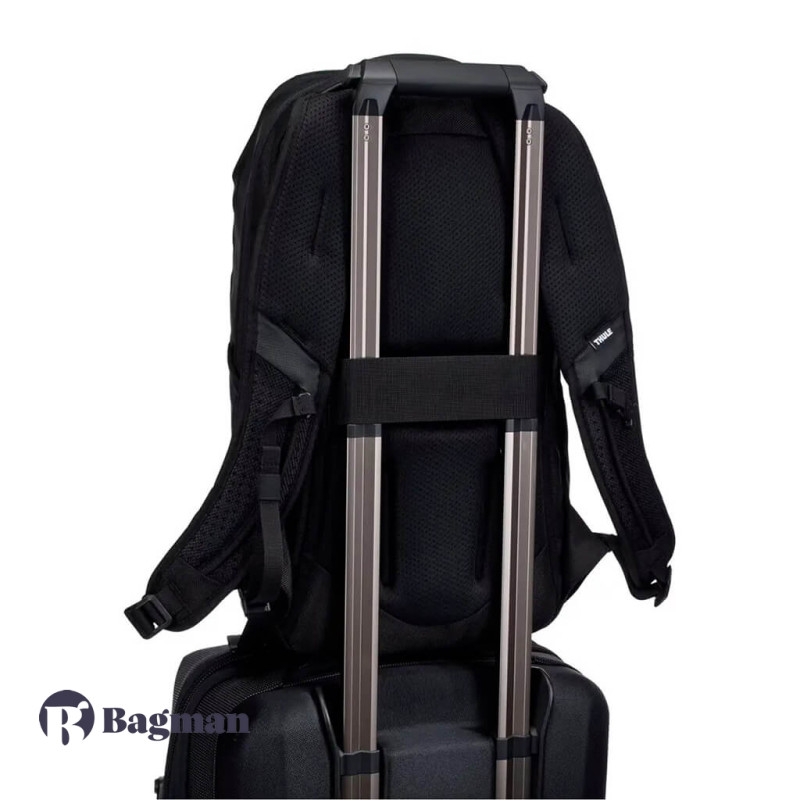 У рюкзака щільна спинка з вентильованим покриттям. На ній є горизонтальний ремінь, який призначений для фіксації рюкзака на висувній ручці валізи. Нагрудний ремінь з регульованою довжиною забезпечить стійке положення рюкзака на спині.