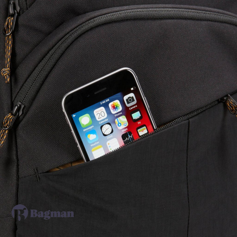 Рюкзак має велике спільне відділення. У ньому знаходиться захисна кишеня для ноутбука і невелика кишеня для дрібниць, у якої прозора поверхня і є застібка-блискавка. Спереду є три додаткові кишені для дрібниць. В одній з них є два сітчастих відсіки і тримач ключів. Верхня кишеня підійде для окулярів або інших крихких предметів. Рюкзак оснащений двома кишенями з боків. Вони використовуються для пляшок з водою.