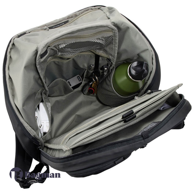 Рюкзак оснащений безпечними відділеннями для ноутбука з планшетом. Всередині передбачено багато кишень, щоб упорядкувати всі речі. В основному відділенні є сітчаста кишеня для пляшки води і кріплення для ключів. На спинці передбачена невелика кишеня, в яку поміститься мобільний телефон. У рюкзаку є кишеня з блокуванням RFID.