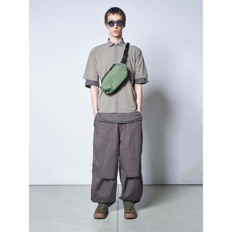 Аксесуар виготовлений з переробленого нейлону з водовідштовхуючими властивостями і паперовою текстурою. Основне відділення застібається двосторонньою прогумованою блискавкою. Всередині є міні-кишені для оптимального розподілу простору і окремого зберігання деяких речей.