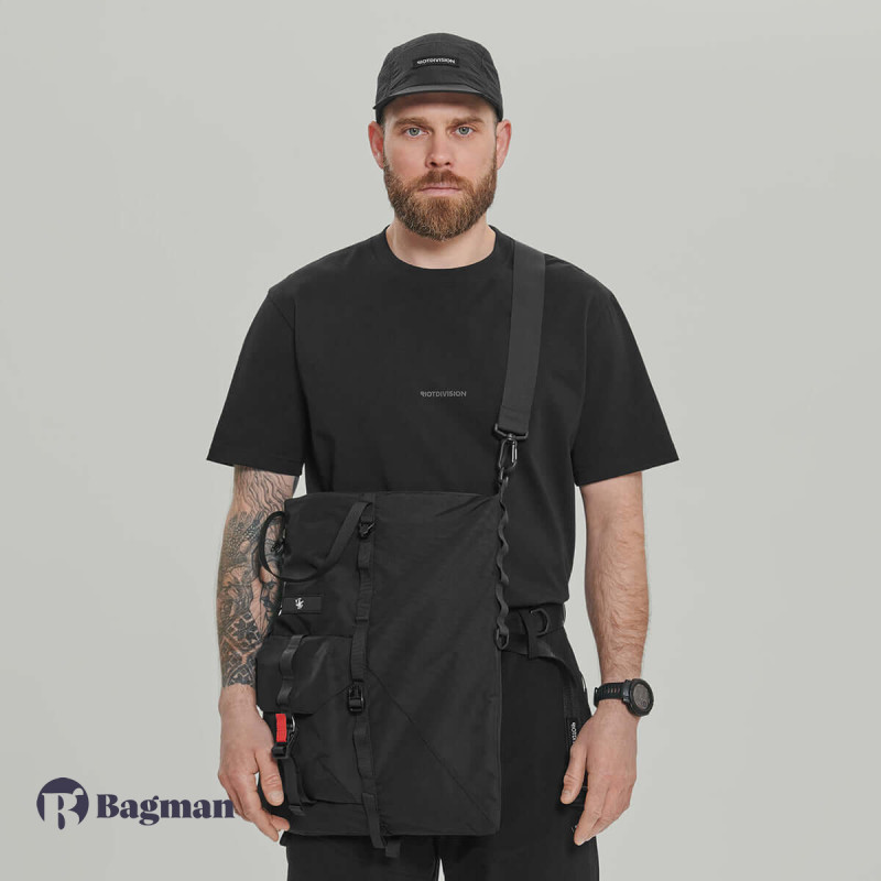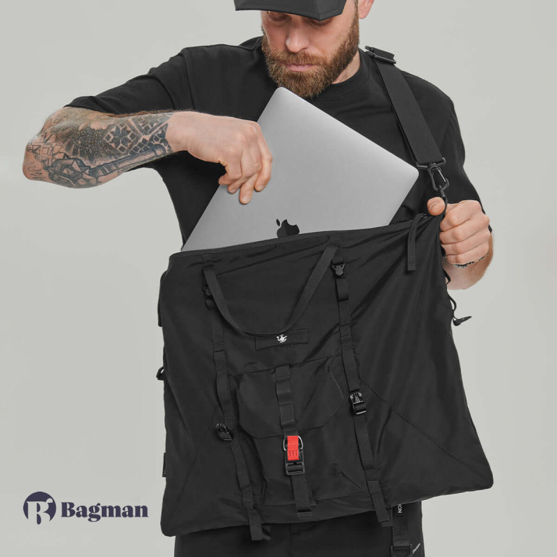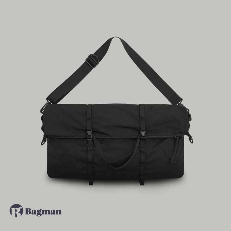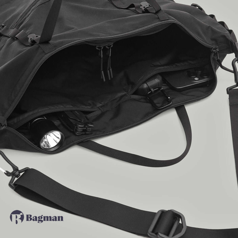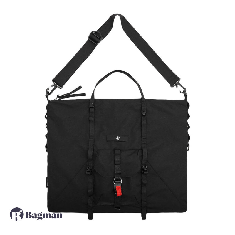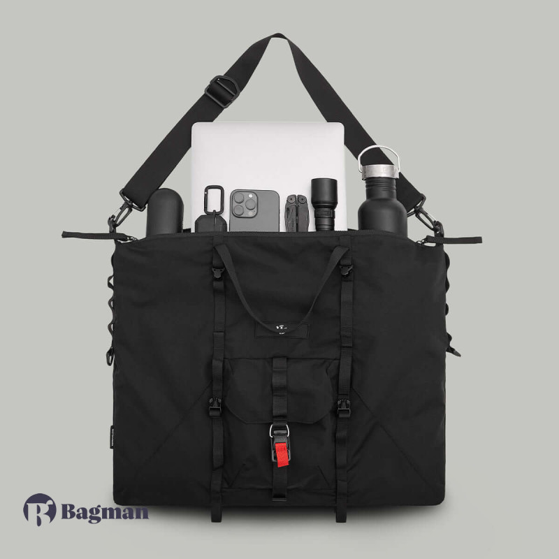 Місткий тоут може бути компактним ролом, складеною навпіл сумкою через плече, або розгорнутий при завантаженні продуктами, тренажерним або кемпінговим спорядженням.