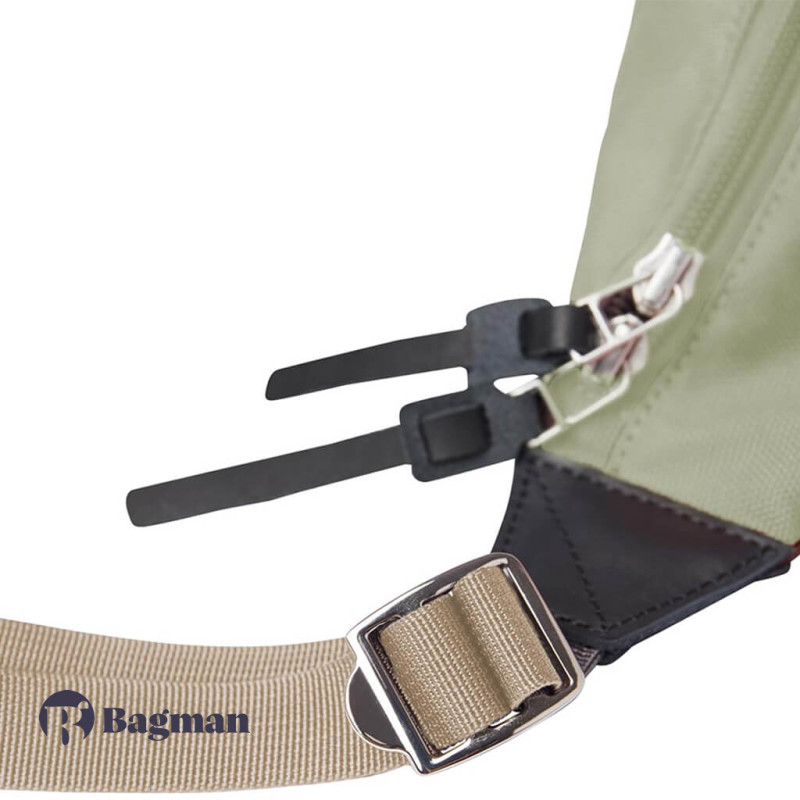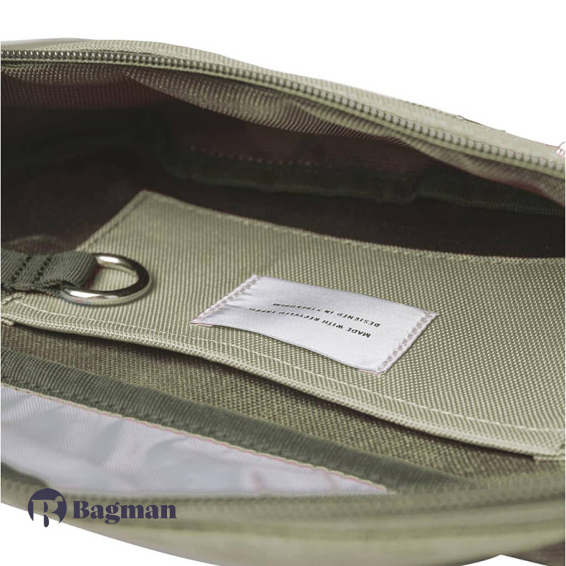 Сумка зроблена зі зносостійкого переробленого поліестеру, деякі деталі виконані зі шкіри. Застібається вона якісними японськими блискавками YKK. У головному відділенні є міні-кишеня без застібок і кільце, до якого можна приєднати ключі. Доповнена сумка невеликою зовнішньою кишенею на блискавці.