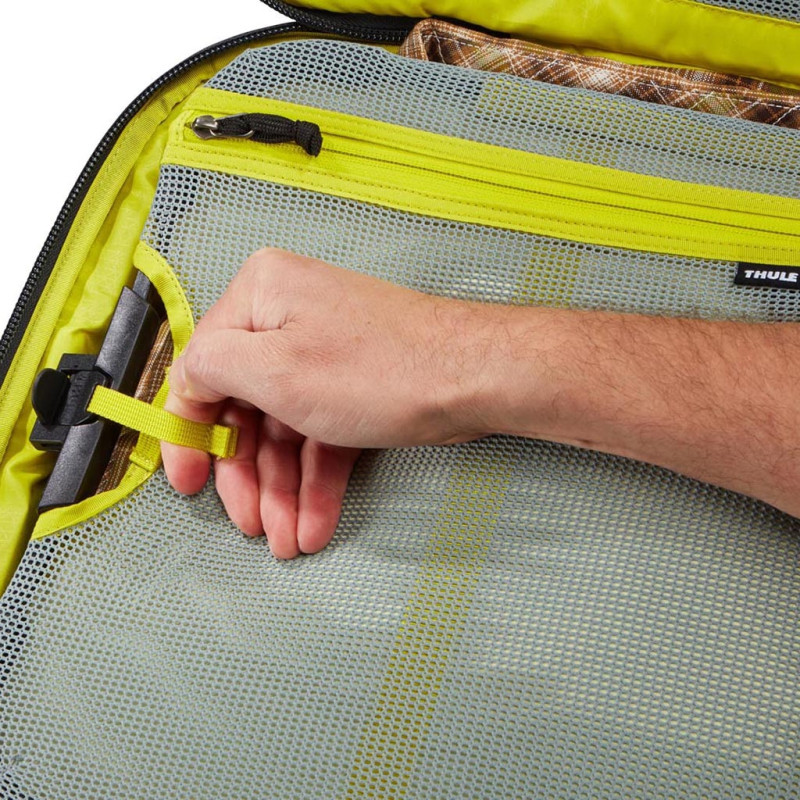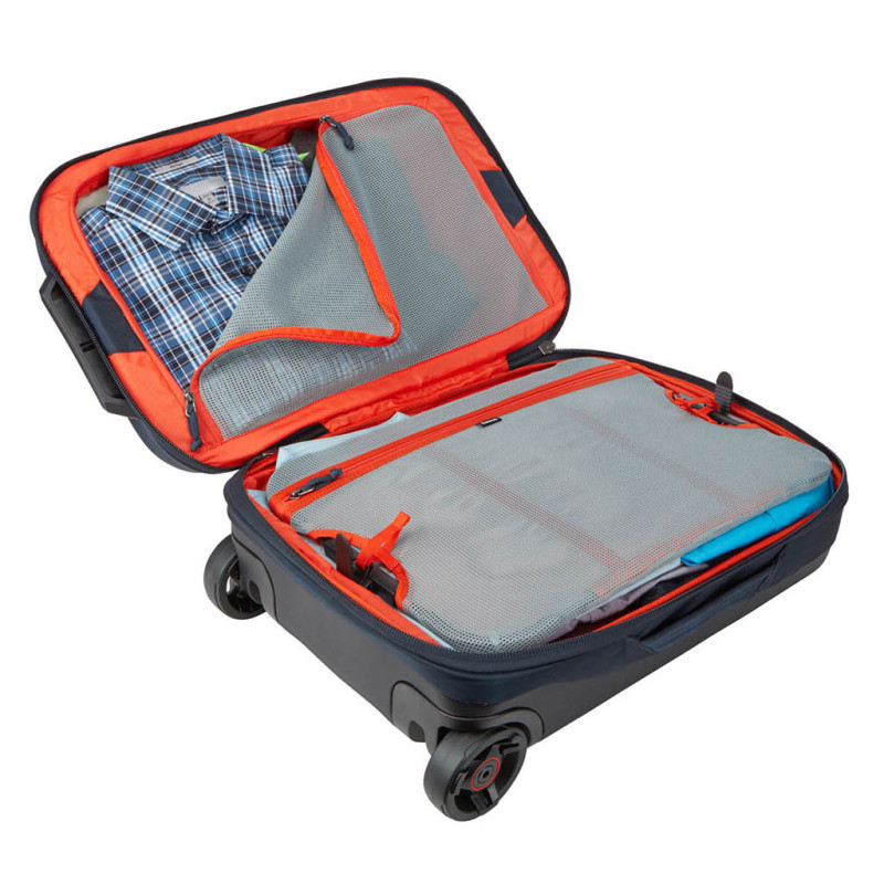 Внутрішній простір складається з декількох відсіків, перегородки між ними виконані з сітчастої тканини і застібаються блискавками по периметру. Це дозволить окремо зберігати одяг, взуття, рушники та інше. Вгорі є доступ до важливих речей, таких як паспорти з квитками, гаманця і ключів.