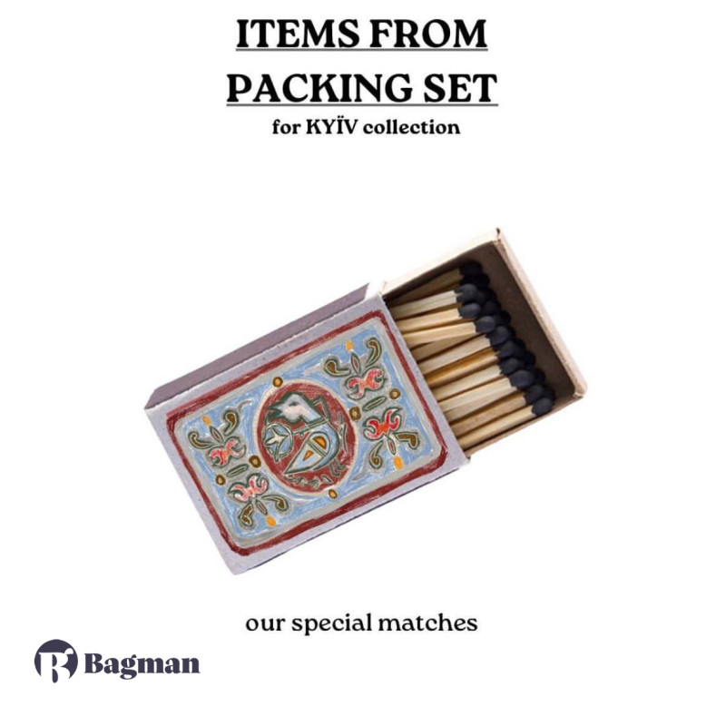 Комплект: сірники, брендоване пакування, інформаційна листівка, наліпки-жетони.